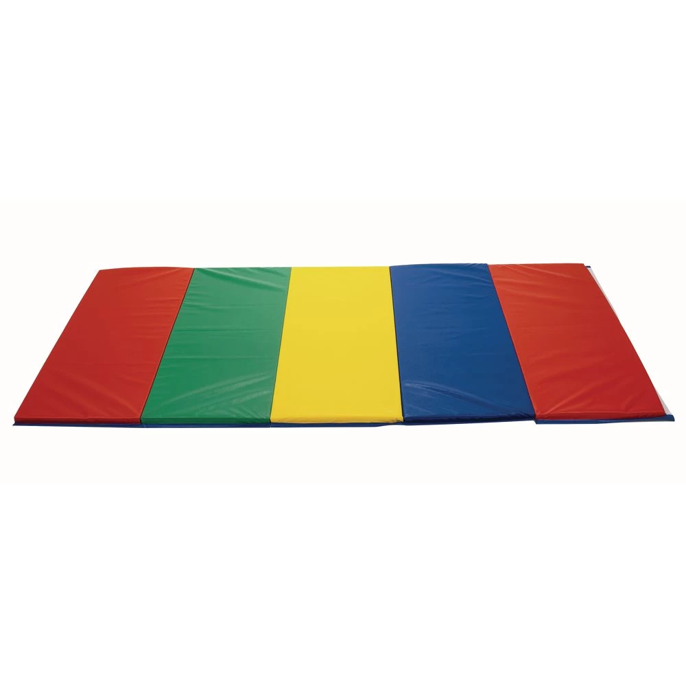 Multi-color 1 1/2″ specially formulated poly foam, designed for exploratory gymnastics or discovery play for preschoolers and toddlers. Double folded seams and hems. Hook-and-loop at both ends fasten mats together as tumbling strips. Light, portable mat with sewn 1 foot and 2 foot panels that fold every 2 feet. All heavy duty 14 oz. vinyl-coated nylon covers meet California specs for flame retardancy. 4′ x 8′ no handles.