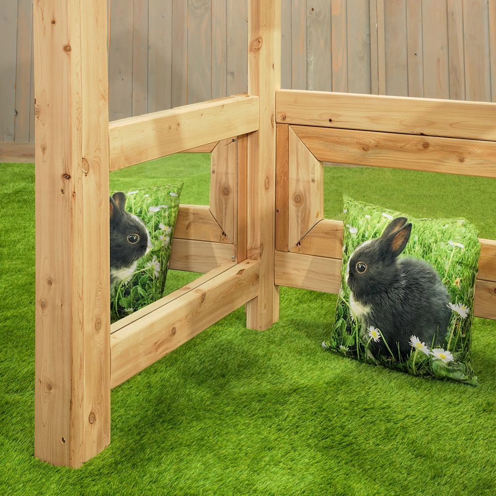 The Outdoor Baby Den features a mirror and a plexiglass window, along with a solid wall for the 3 sides. The airy open top allows you to weave colored material or burlap to create a fun and magical place for infants and toddlers.