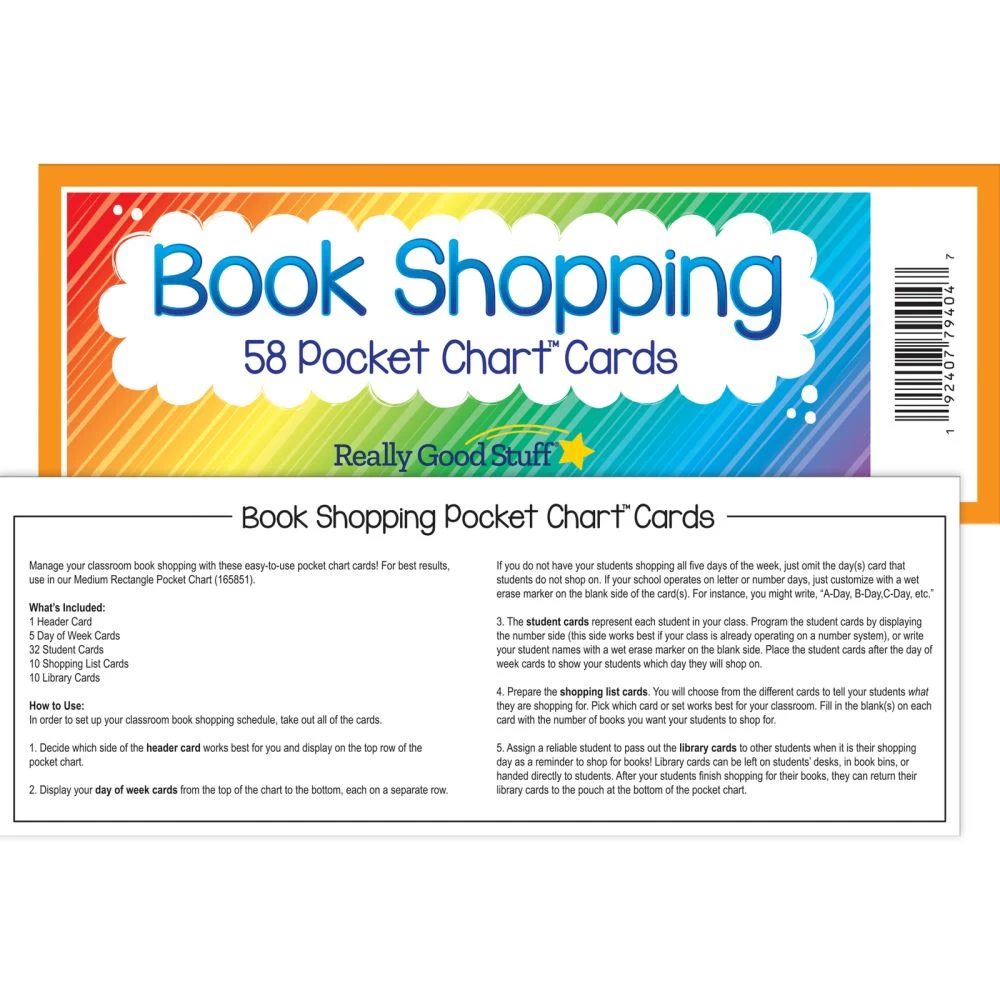 Make Shopping For Books An Organized Treat With This Ingenious Pocket Chart And CardsMake shopping for classroom books a treat instead of a challenge with this ingenious pocket chart and cards! Students can easily see when they need to shop for new books and what type of books they need to shop for. The clear and customizable cards promote student independence and save you time!*Clearly Organized: Clearly display the time for book shopping in your classroom, which students get to shop on which day, and for what category. Take the stress out of shopping for books!*Customizable Design: There are five day-of-the-week cards, 10 shopping list cards, and 10 library cards that slot into the sturdy pocket chart, plus 32 individual student cards so you can organize every shopping trip in advance. The cards are all double-sided, with the backs customizable so you can adjust the shopping days and the type of books kids can shop for as needed.*Persuade Reluctant Readers: The faux credit card for book shopping will intrigue your reluctant readers and make picking out a book a fun event for them.*Promote Student Independence: With a book shopping system like this in place, you dont have to individually counsel each student about book selection. They can find their name, the date they shop, and the type of books to shop for all on their own. It teaches them independence and saves you time!*Enough For The Whole Class: There are 32 individual student cards, enough for your whole class. Plus, the system works across many grade levels so you can take it with you whatever grade you teach!*Laminated And Durable: The cards are double-sided and laminated, and the pocket chart is made of sturdy polyester, so this set will last through steady student handling and usage.Turn shopping for books into a treat with this well-organized pocket chart system.