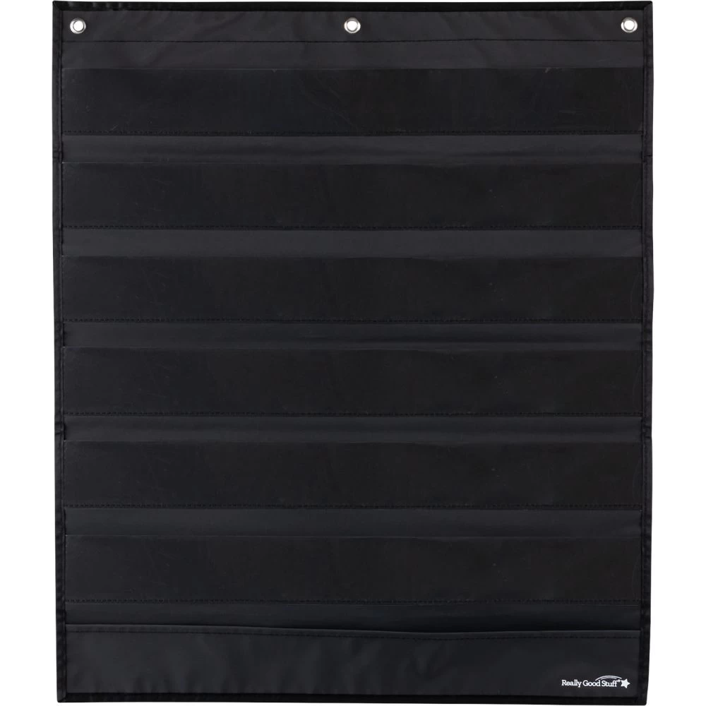 1 pocket chart * with 6 rows of pockets and 1 bottom storage pocket * Size: 22″ by 26″ * Color: black * 58 cards * laminated * double-sided * including 1 header * 5 day-of-the- week * 10 shopping list * 10 library * and 32 student cards * Header Card * Size: 8″ by 3″ * Day-Of-The-Week * Shopping List * Library Card * Size: 5″ by 3″ each Student Card * Size: 3″ by 2″ each