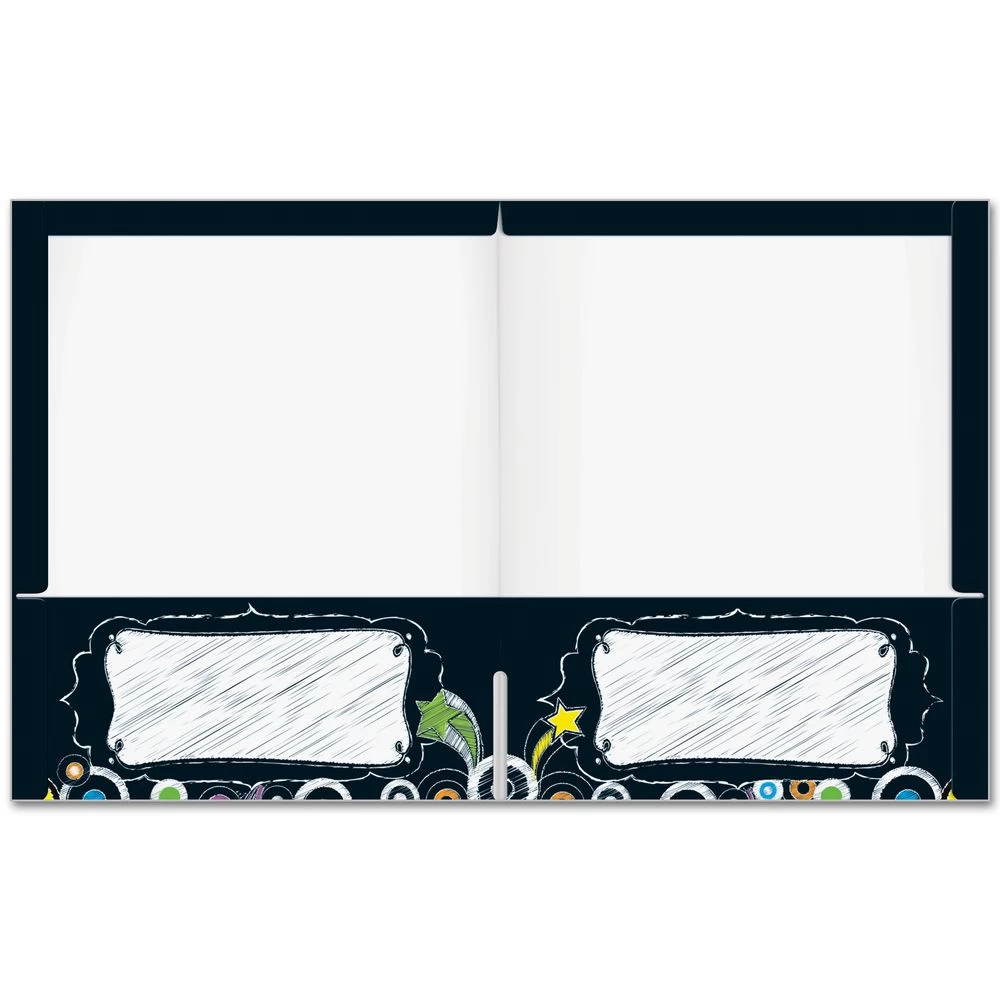 These attractive black folders with a sophisticated chalkboard art style provide space for the student’s name on the cover and two pockets with an area to label as you like.