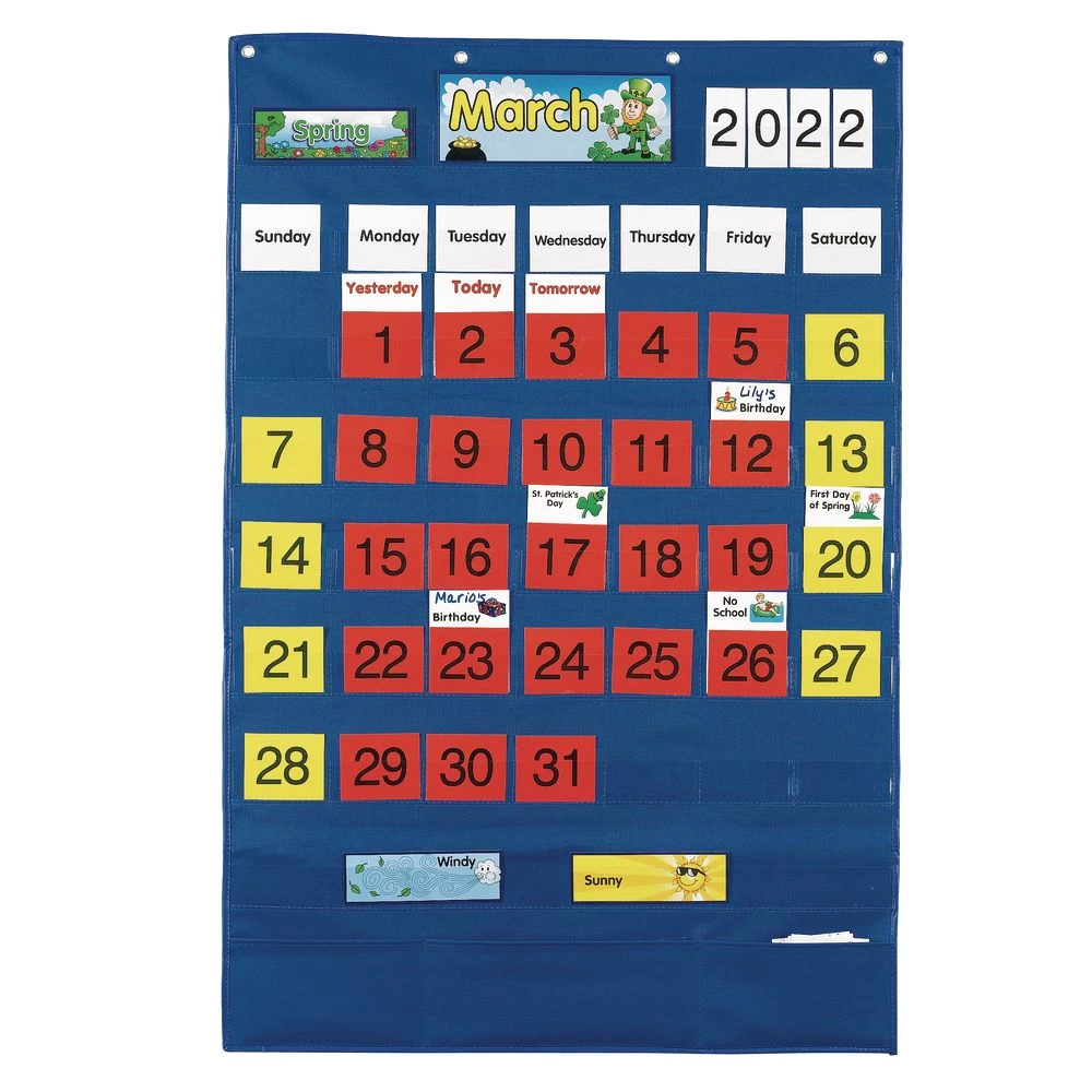 When it comes to structuring the day and helping your students understand the day’s events, our Classroom Wall Calendar is the perfect solution. With 46 clear pockets and 100 bilingual cards (reverse side in Spanish), this classroom calendar is a welcome addition to any early-learning, elementary school classroom. A great educational resource for activities like learning the days of the week, months of the year, seasons, and weather. Plus, the dry-erase, special day cards, let you create your own special events like birthdays and other occasions to celebrate.
