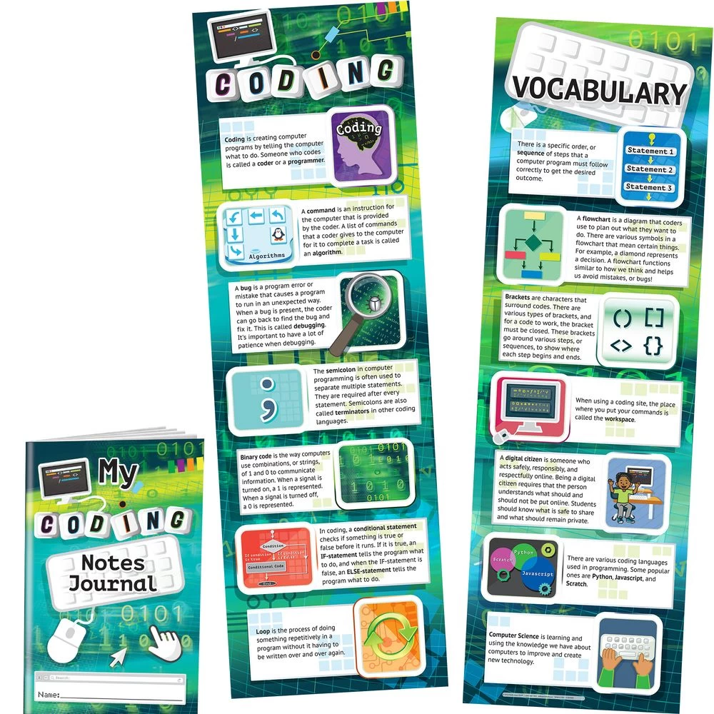 Introduce students to coding with two double-sided banners that feature a KWL chart, tips, and vocabulary. The matching journals have lots of space for students to write down definitions and notes as they learn the fundamentals of coding.