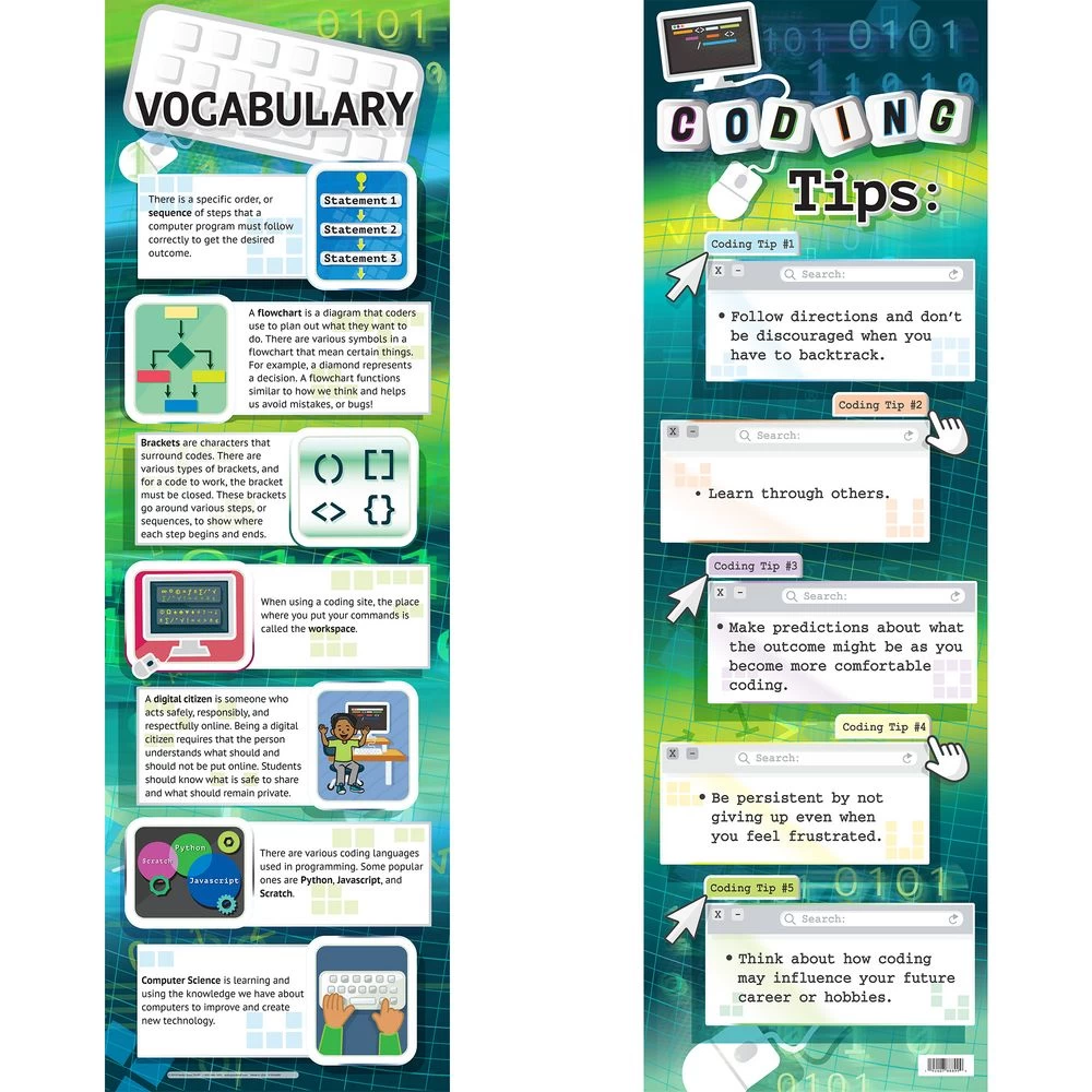 - 2 Double-Sided, Write-On/Wipe-Off Banners: Laminated on both sides for durability, these banners have a KWL chart to fill in with the class, coding tips, and definitions of a variety of coding terms. Leave them up all year for your young coders to reference.