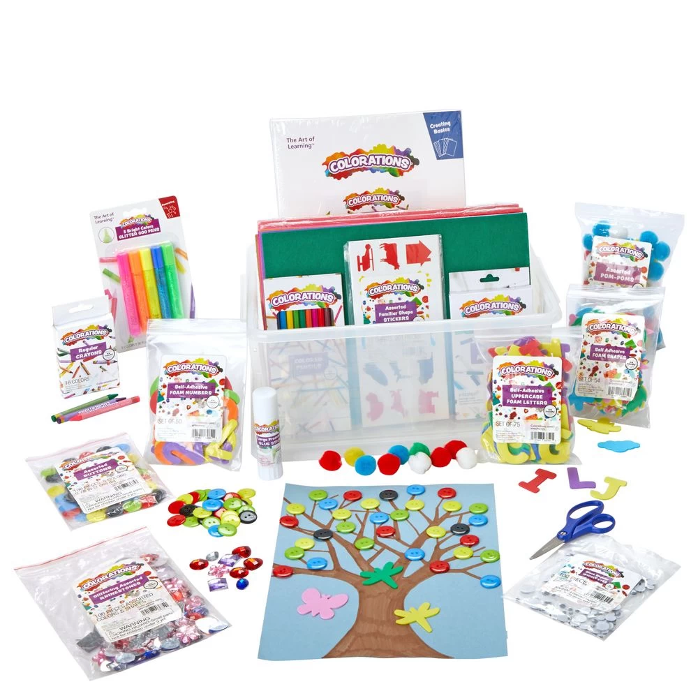 - WHAT YOU GET: 8 Markers, 12 Pencils, 16 Crayons, 100 Buttons, 100 Rhinestones, 100 Pom Poms, 50 Self-adhesive shapes and 50 Numbers, 15 self-adhesive letters, 5 glitter glue pens, 10 felt sheets, drawing pad, assorted construction paper, glue and glue stick, blunt scissors & a bin.