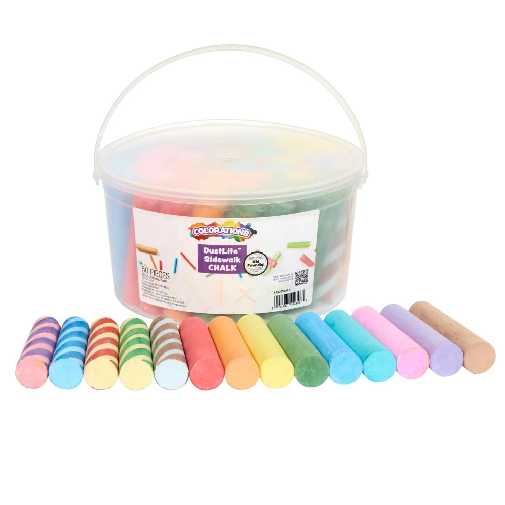 - WHAT YOU GET: 50 pcs. of washable sidewalk chalk. Measure 4 inches x 1 inch. Colors: blue, green, orange, pink, purple, red, white, brown, & yellow. Sticks are solid colors & patterns such as stripes, dots, & marbled designs. Comes in resealable bucket with handle.