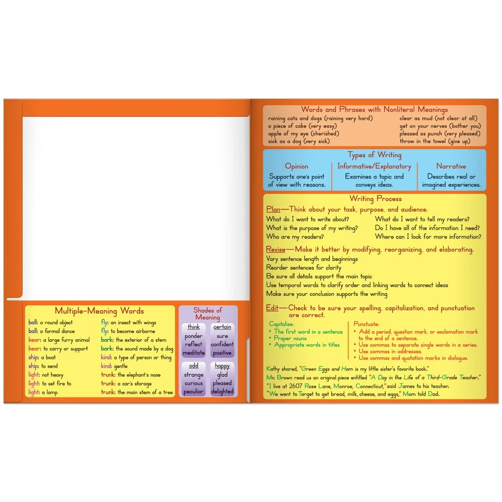 This four-pocket folder doubles as a handy reference tool. Chock full of grade-appropriate information to support the CCSS, it covers language arts skills, such as parts of speech, verb tenses, nonliteral words and phrases, and the writing process. Math resources include a multiplication grid, units of measure, and the formula for determining area. The Guide lists the CCSS skills covered.