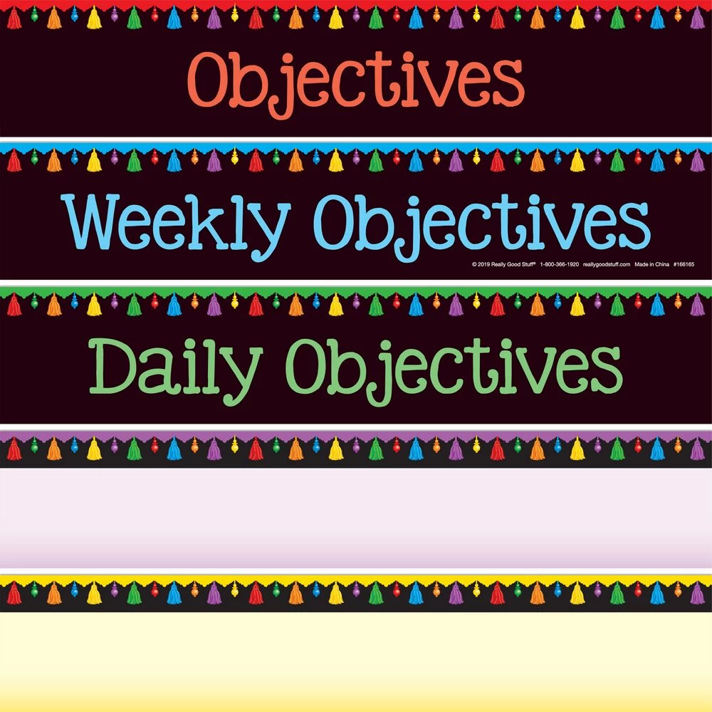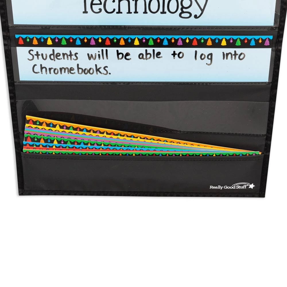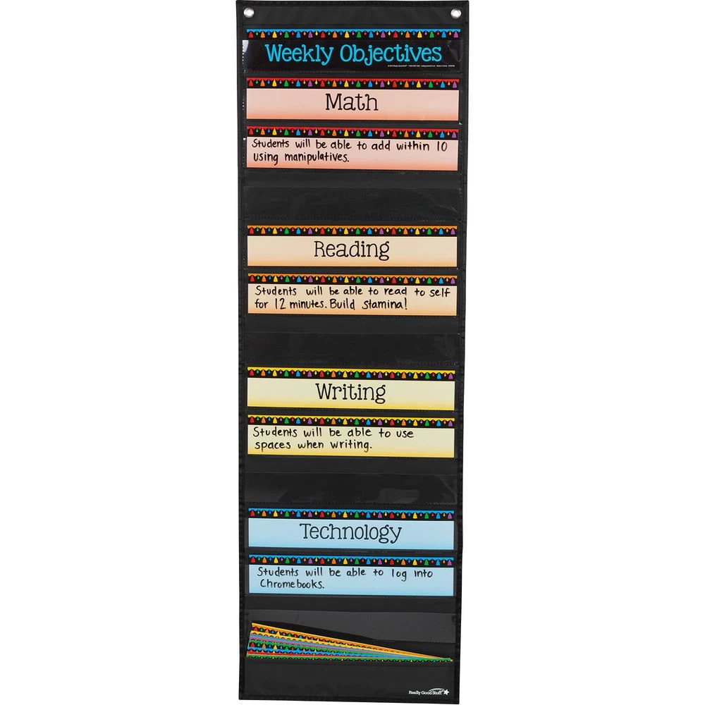 Display Classroom Goals At A Glance Using This Daily Objectives Pocket Chart And CardsThis pocket chart set lets you display your written objectives for students at a glance. It comes with cards that have preprogrammed subjects or headers on the front and programmable space on the back, and blank cards in six colors to write your objectives on.*A Clear Statement: This well-designed daily objective pocket chart and cards let you clearly set out your goals for the class, so they can be seen and understood at a glance.*12 Subject Cards: The 12 subject cards have preprogrammed names on one side, but blank backs so you can write whatever subject down you want the class to work on.*24 Blank Cards: The 24 blank cards allow you to write down your objectives for the class, and they come in six colors: four each of red, orange, yellow, green, blue, and purple. You can use them to color-code objectives for small groups.*Pop Them Into The Long Pocket Chart: These colorful and sturdy cards fit perfectly into the long pocket chart. The streamlined design doesnt take up much space but packs a lot of classroom organization into a small space.*Laminated, Dry Erase, And Durable: The pocket chart is durable polyester and the cards are laminated and write-on/wipe-off, so the set will last and is reusable. A system thats eco-friendly as well as classroom-friendly!Let your class see at one glance what your objectives are for them, using this daily objectives pocket chart system.