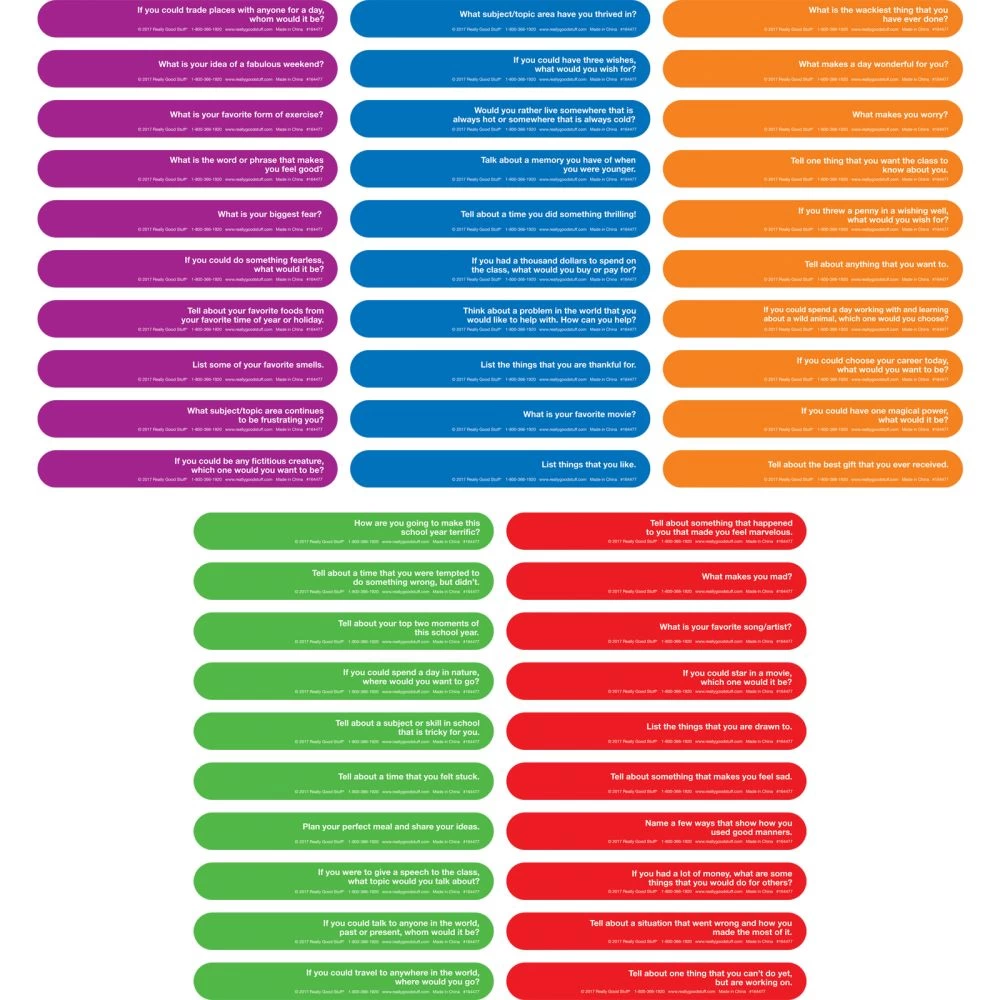 This color-coded set includes 10 prompts for each day of the school week and 10 blanks to create your own. Have the whole class or individuals respond verbally or in writing. Assign the prompt or let students pick their own. Great for morning meeting.
