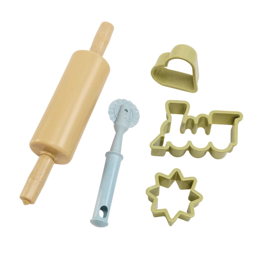 - 11 PIECE SET: Baking set includes bowl, mixing bowl, whisk, rolling pin, fluted pastry cutter, and 6 cookie cutters in different shapes.