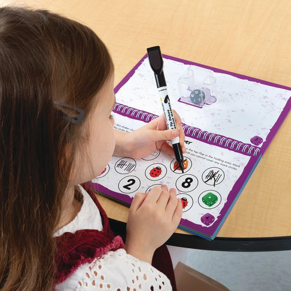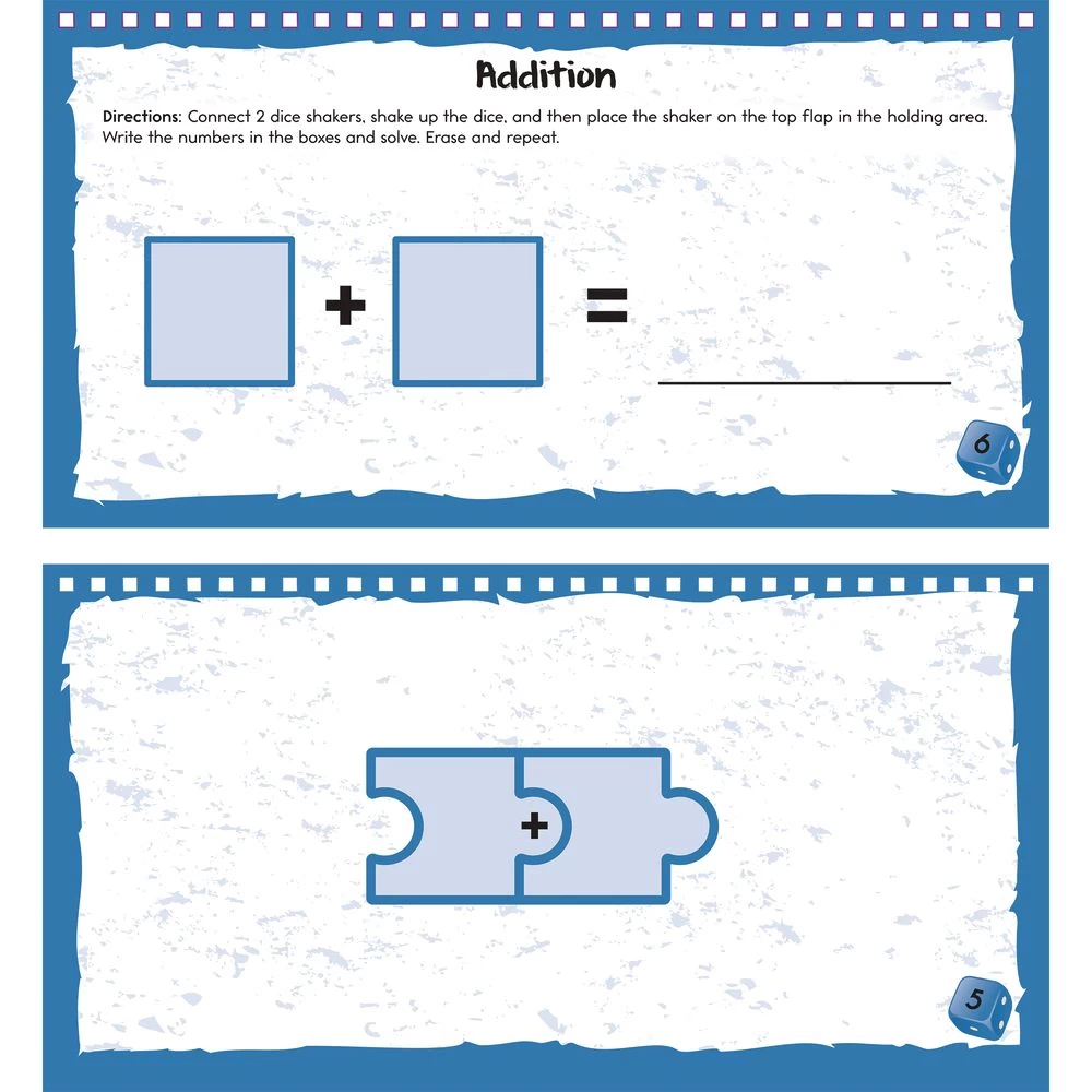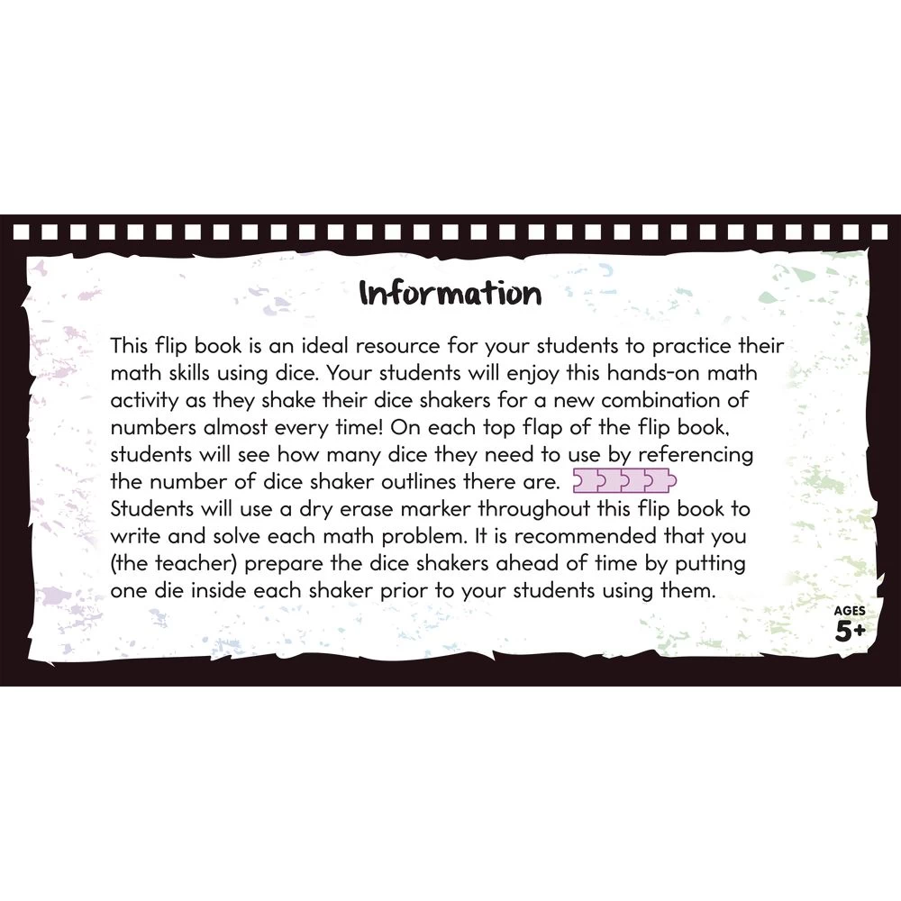This versatile hands-on learning kit packs a host of fun materials for math skills practice. Four flip books cover multiple topics and make for great practice all year long. Activities target number sense, addition/subtraction, fact families, place value, graphing, and more. They work well in centers as it’s easy to switch to a new topic. The 16 black, 10-sided dice with the 16 interlocking dice shakers make learning enjoyable for kids. They can select the number of shakers they need, and dice don’t fly around during play.*Flip Books Offer A Variety Of Activities: Four flip books cover many math practice skills, like number sense, addition/subtraction, fact families, place value, graphing, and more.*16 Special 10-Sided Dice Make Learning Hands-On: The 16 black, 10-sided dice in this kit provide kids with a tactile method of reinforcing number sense.*16 Interlocking Dice Shakers Make It Fun: The unique attachable dice shakers are made to fit these dice, and allow children to connect more shakers depending on the activity they choose. They also keep dice play controlled and prevent dice from getting lost.Appeal to tactile learners with this unique math skills kit that sports dice, shakers, and flip books!