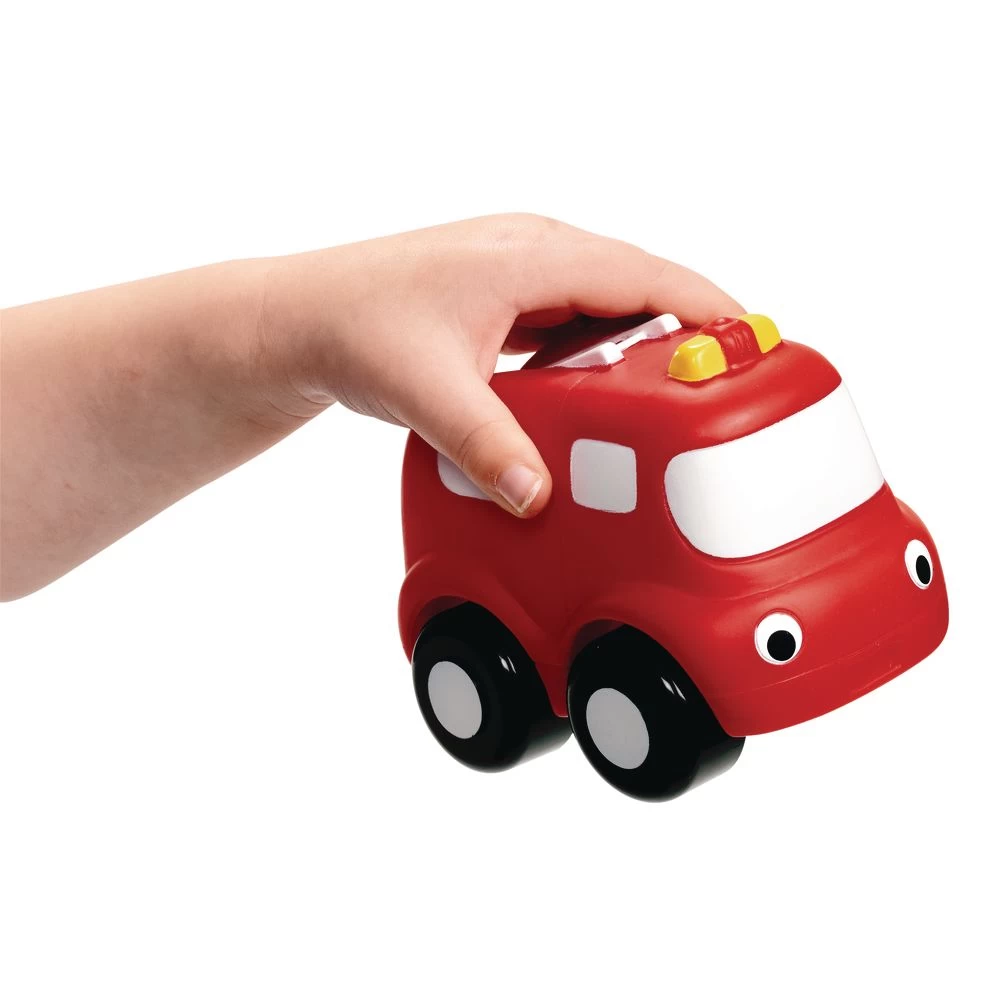 - SET INCLUDES: Four soft, squeezable vinyl vehicles that feature a fun, friendly face: school bus, fire engine, police car and airplane. Cars measures 4-inches long x 3-inches high.