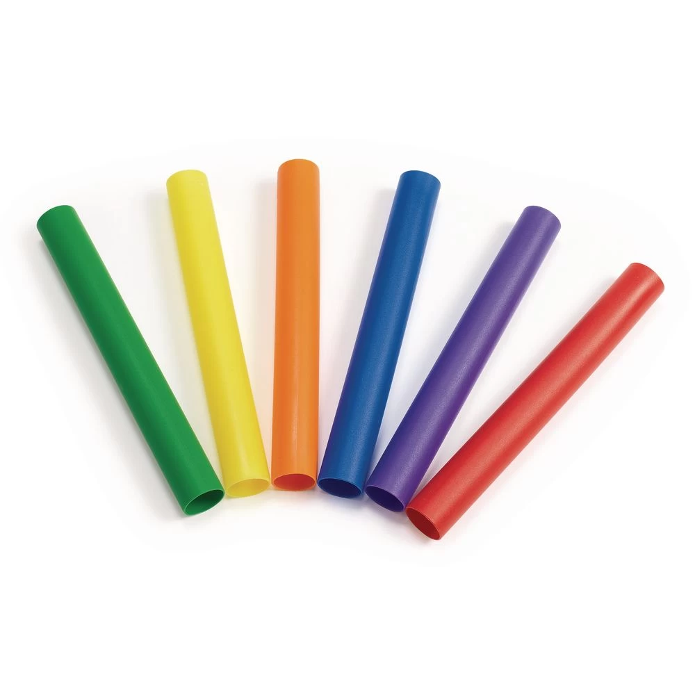 This set of 6 brightly colored, durable plastic batons is ideal for indoor and outdoor activities.