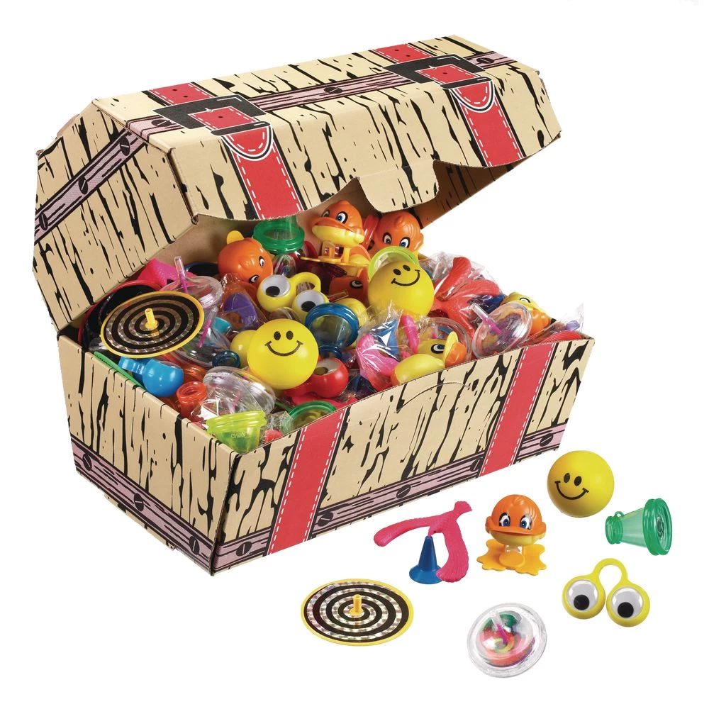 Motivate students with rewards they can twist, spin, balance, squeeze, and flip. While these toy are fun for all ages, these functional items will engage students while strengthening fine motor skills. The realistic corrugated cardboard treasure chest stores them all in one convenient place.