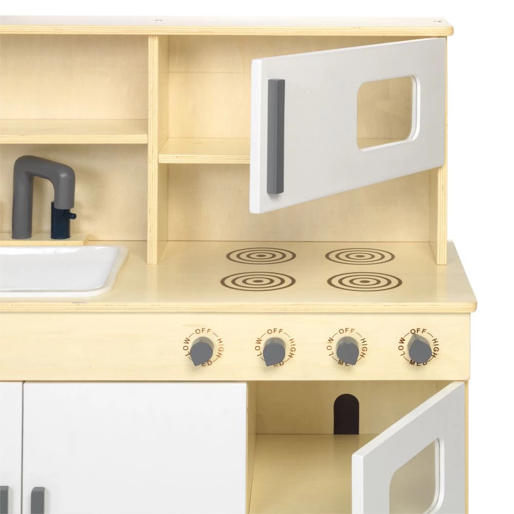 Our Combination Kitchen provides everything kids need for enriching kitchen play experiences. It features rounded corners for safety and a kick space to keep small objects from rolling underneath. The lower cabinet, oven, and microwave door panels are painted white and hinged from top to bottom to prevent fingers from getting pinched. Its durable design guarantees it will endure years of rigorous use.