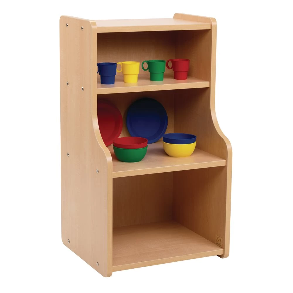 Lots of space for dishes and cookware. Constructed of easy-care .75″ maple patterned laminate. Rounded corners for safety. 32″ tall x 18″ wide x 16″ deep at base. Preassembled.