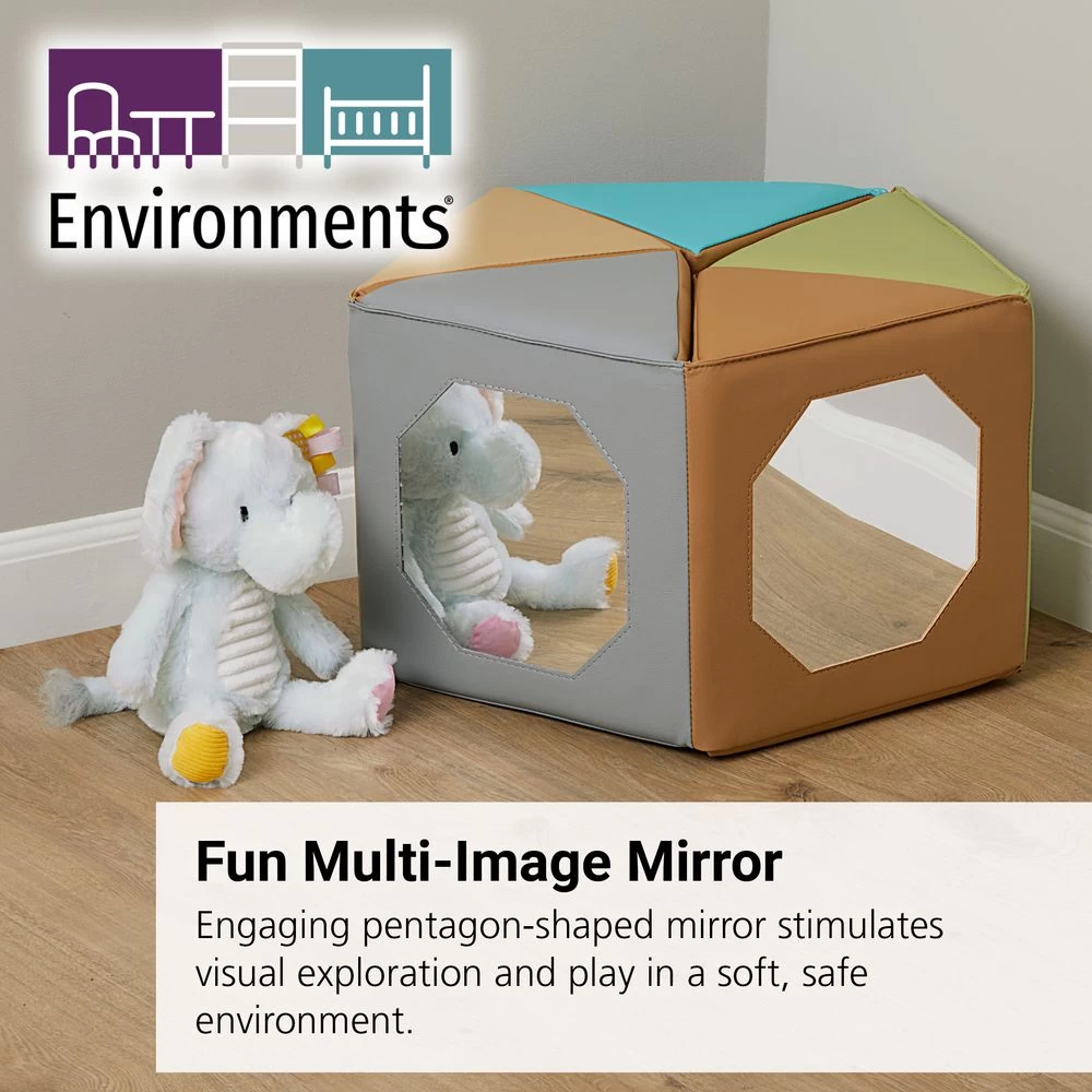 Why settle for 1 mirror when you can give babies 5? The Multi-Image Mirror Pentagon engages early-crawlers during tummy time in a semi-circle of shatter-resistant, acrylic mirrors. Mirrors help babies develop self-recognition, body awareness and spatial awareness in a safe environment. Mirrors also foster curiosity and help babies develop better eyesight as they track movement. Constructed using durable foam and covered in soft vegan leather.