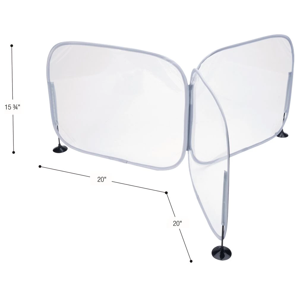 The clear 3-way tabletop divider provides a spacious work area while still allowing students to see their friends – they’re separated for safety but together for fun! The 3-Way Divider provides two 20-inch x 20-inch work areas on rectangular or corner tables and measures 15.75 inches high. Simple installation, easy to set up, remove, and install wherever a separation is needed. Folds flat for storage. Made of durable PVC vinyl with attractive edge binding. Wipe with mild cleaner, do not bleach. Set includes 4 barriers.