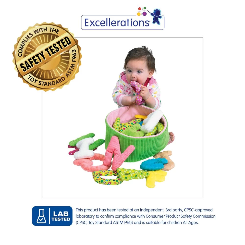 Let little ones explore alphabet letters in soft plush fabrics and experience an engaging variety of textures and sounds.