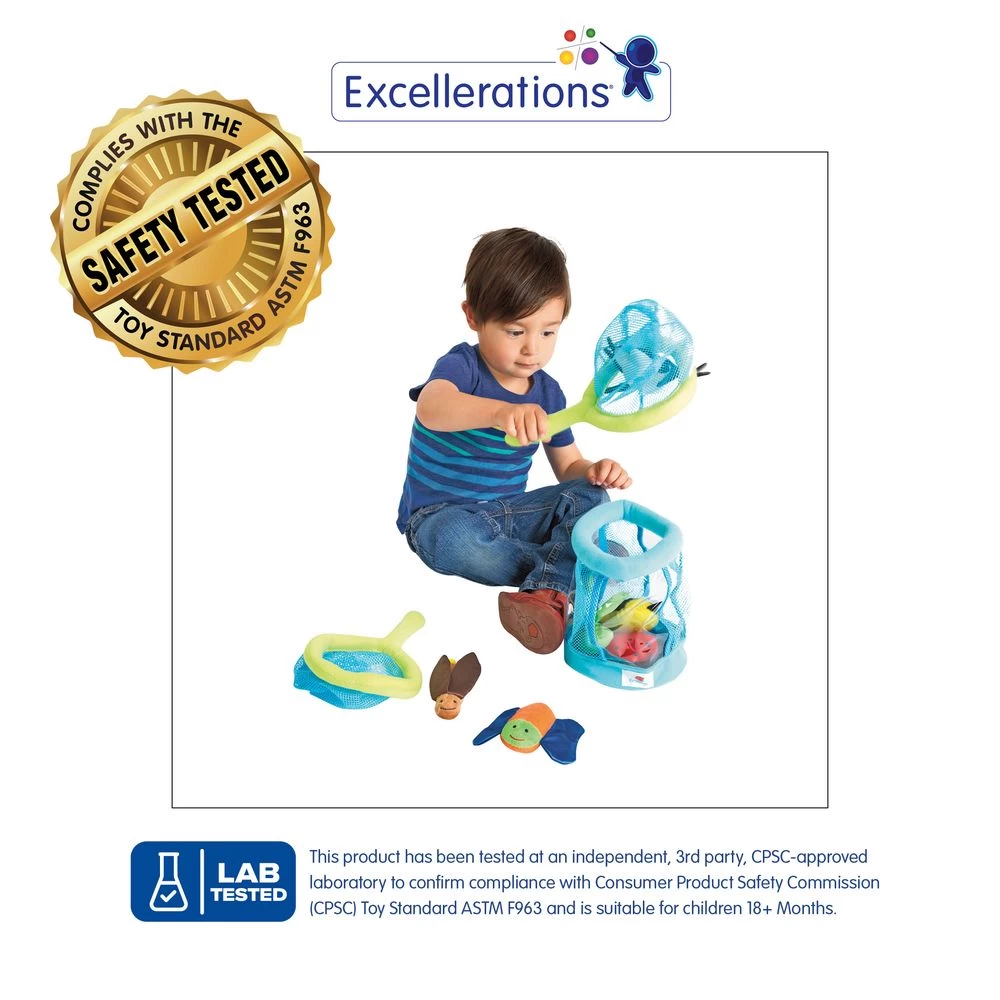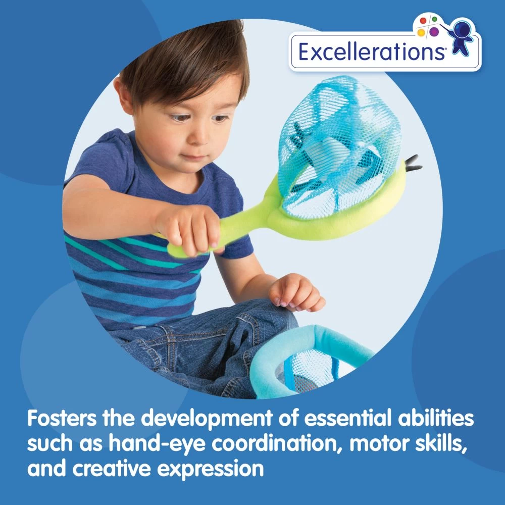 Toss and catch these colorful bugs for hours of soft play fun! Catch bugs in 2 nets and store them away in the soft mesh jar. Perfect for building hand-eye coordination, gross motor skills and creativity.