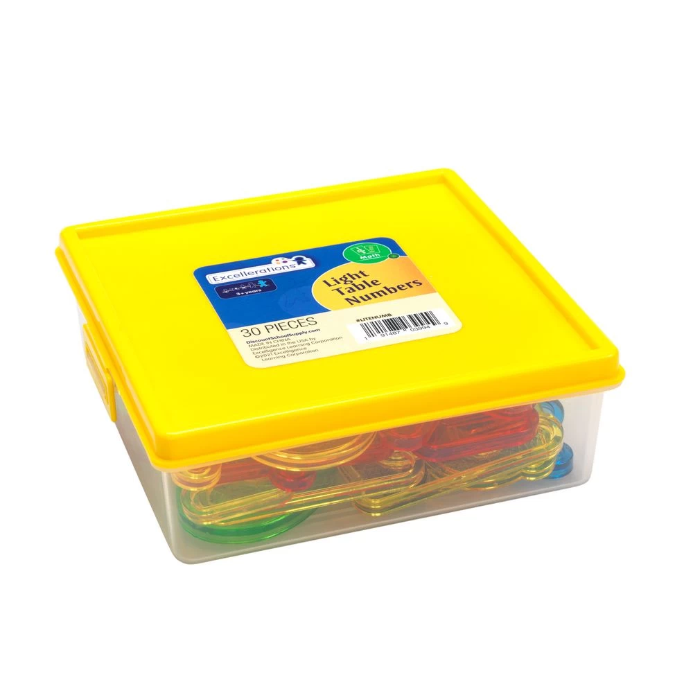 The Excellerations® Light Table Numbers – Set of 30 is a great product to use on or off a light table. The plastic material and large size make them easy to manipulate. They are also easy to clean. They come in a plastic container with a locking lid, so they are easy to store. You get 3 each of the numbers 0 to 9 and they can be used for things like counting, number identification, number order, and more.