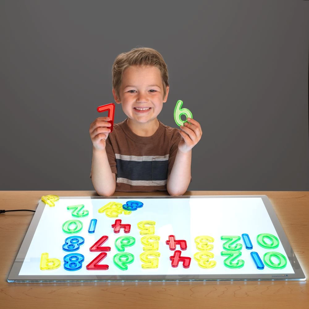 - TRANSLUCENT MATERIAL: The bright and cheerful colors are beautiful whether you use them on a light panel or not. Each number is large enough for small hands to move and manipulate.
