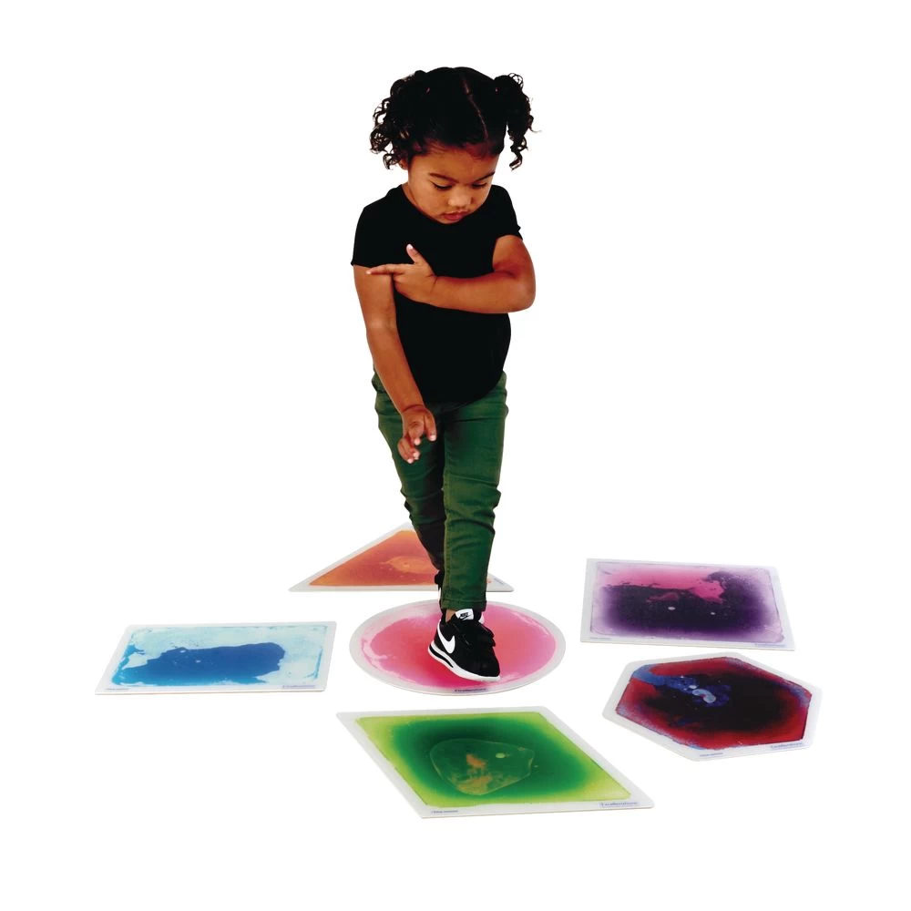 Moving, bubbly liquid tile mats create an amazing sensory experience! The colorful liquid reacts to the pressure of the foot, creating a burst of color with every step. Great for games that involve stepping, jumping, and dancing. Mats are leak-proof, anti-slip, and sturdy.