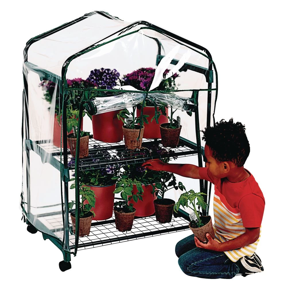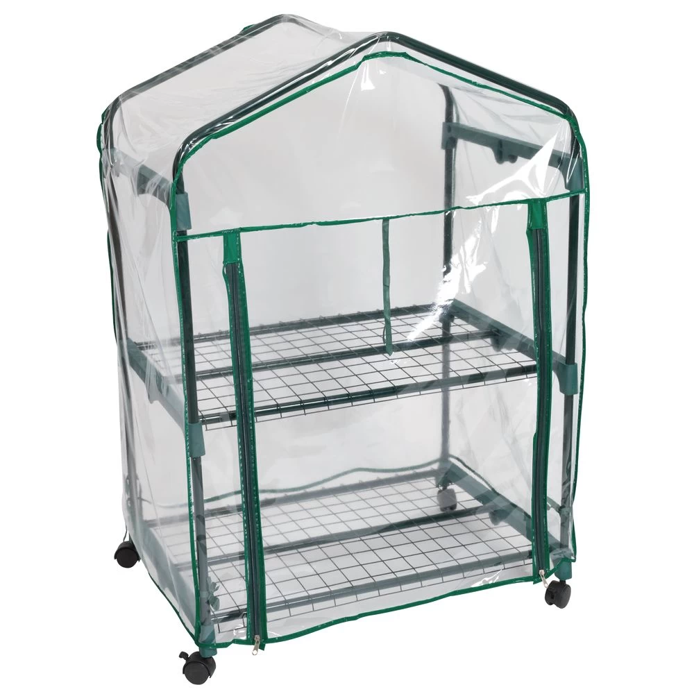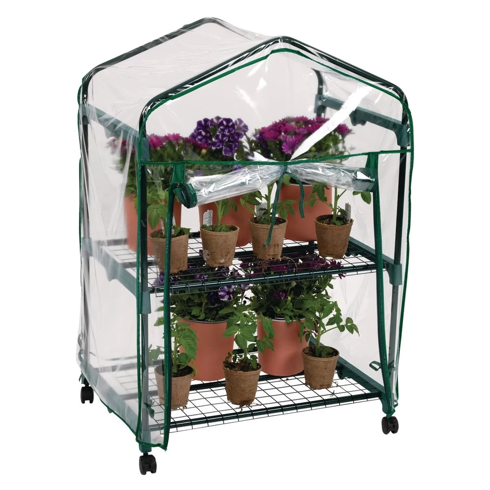 This sturdy metal and plastic greenhouse has two wire shelves that each hold up to 20 four-inch potted plants, or 20 pounds of supplies. Removable cover protects tender plants and retains humidity for optimum growth. Cover ties to frame and zippered front. Easy to move to any sunny spot indoors or out, locking casters keep it in place. Assembly sheet included for simple snap-together assembly.