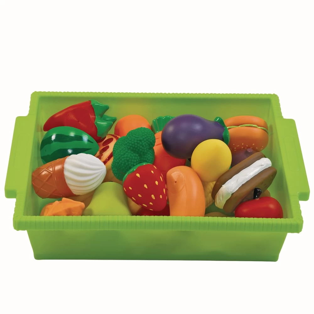 - 24 PIECES WITH STORAGE: The included smart storage bin fits the large assortment of food items including: apple, pear, bananas, grapes, orange, lemon, strawberry, water melon, tomato, yellow pepper, chilies, broccoli, carrot, corn, eggplant, union, hotdog, burger, pizza, fried egg, chicken, ice cream sandwich, ice cream cone, and donut.