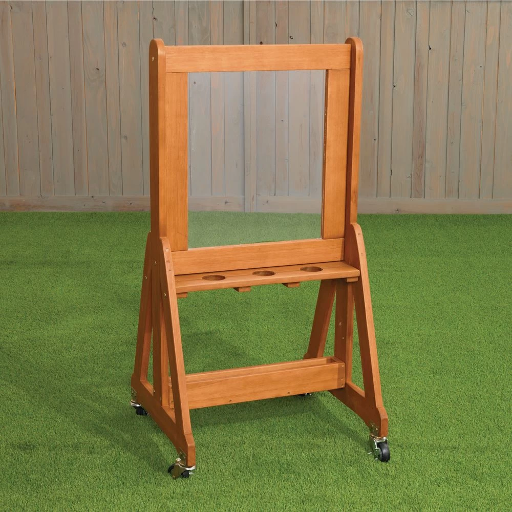 Paint or draw right on the acrylic panel or attach paper. Acrylic paper easily wipes clean. Double-sided painting wall has clear acrylic painting panel, supply shelf, paint cup holders, and storage tray. Four oversized locking casters make unit easy to move, locks securely in place. Frame is made of solid, weather-resistant eucalyptus wood. For children ages 3 years and older.