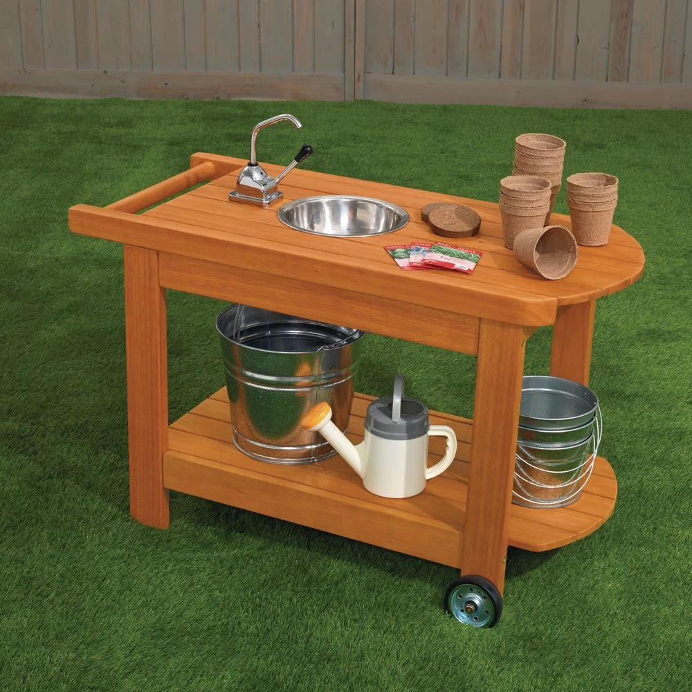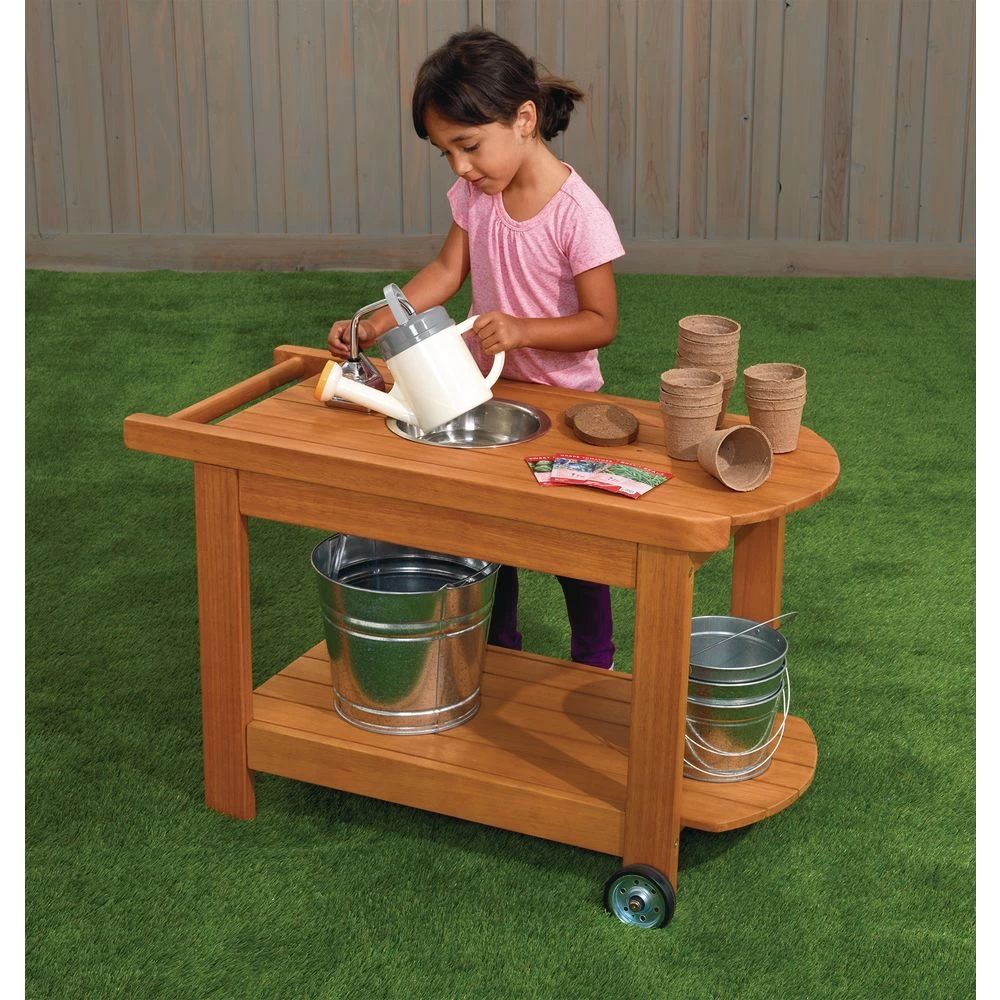 Easily expand your learning space with the outdoor rolling planting cart with water pump. This cart can easily be wheeled indoors and outdoors for gardening and water play fun! Children will learn about plants and biology related topics while engaging their creative side.