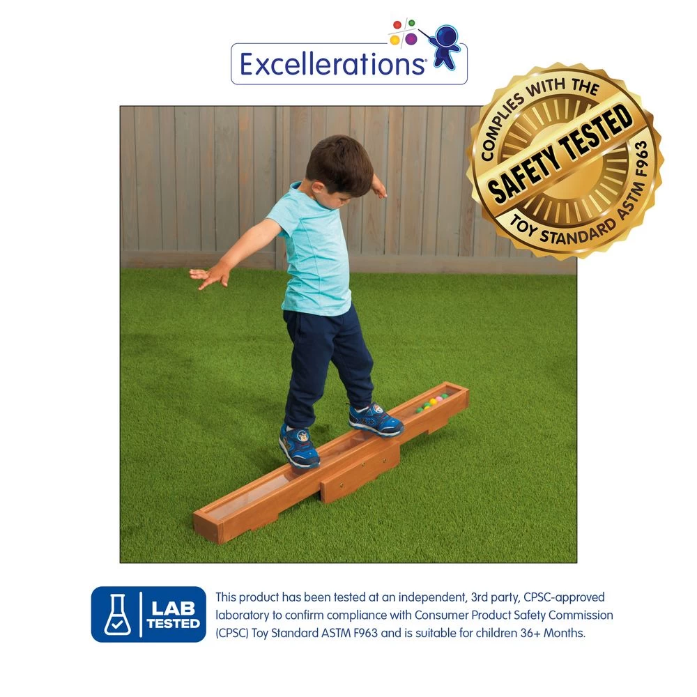45″ long balance bar with clear acrylic top and ten 1″ wooden balls. Beam rocks back and forth with a gentle touch to set the balls in motion to produce soothing sounds. A stronger push will result in more vigorous rocking and more vibrant sounds. Perfect for indoor or outdoor use. For children ages 3 years and older.