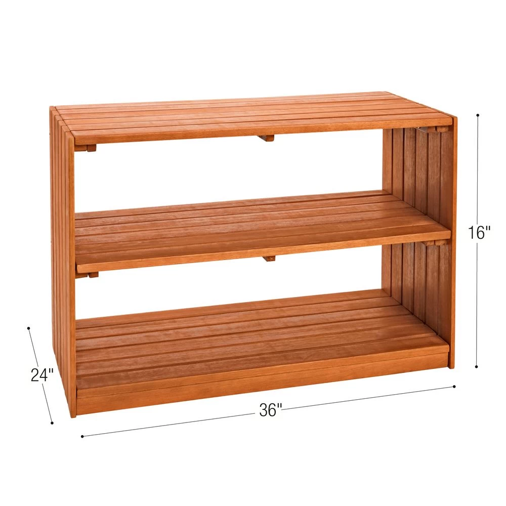 Spacious unit stores toys, games, supplies and more – indoors or out – on easy-to-access shelves. Made of durable eucalyptus wood that holds up to all kinds of weather for years of storage. Easy assembly, all hardware included. Great as a plant shelf or deck or patio table too.