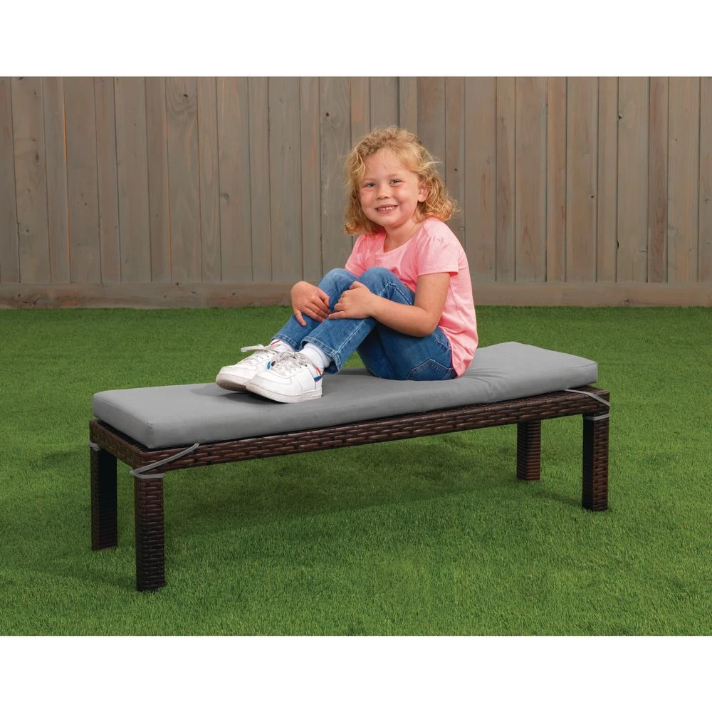 - OUTDOOR DINING IN STYLE: Bench has classic yet contemporary look that’s attractive and practical – perfect for outdoor dining on the deck or patio or for nature-inspired classrooms. Lightweight aluminum frame is wrapped with wicker-look plastic strips in variegated shades of browns and grays that look and feel like real wicker.