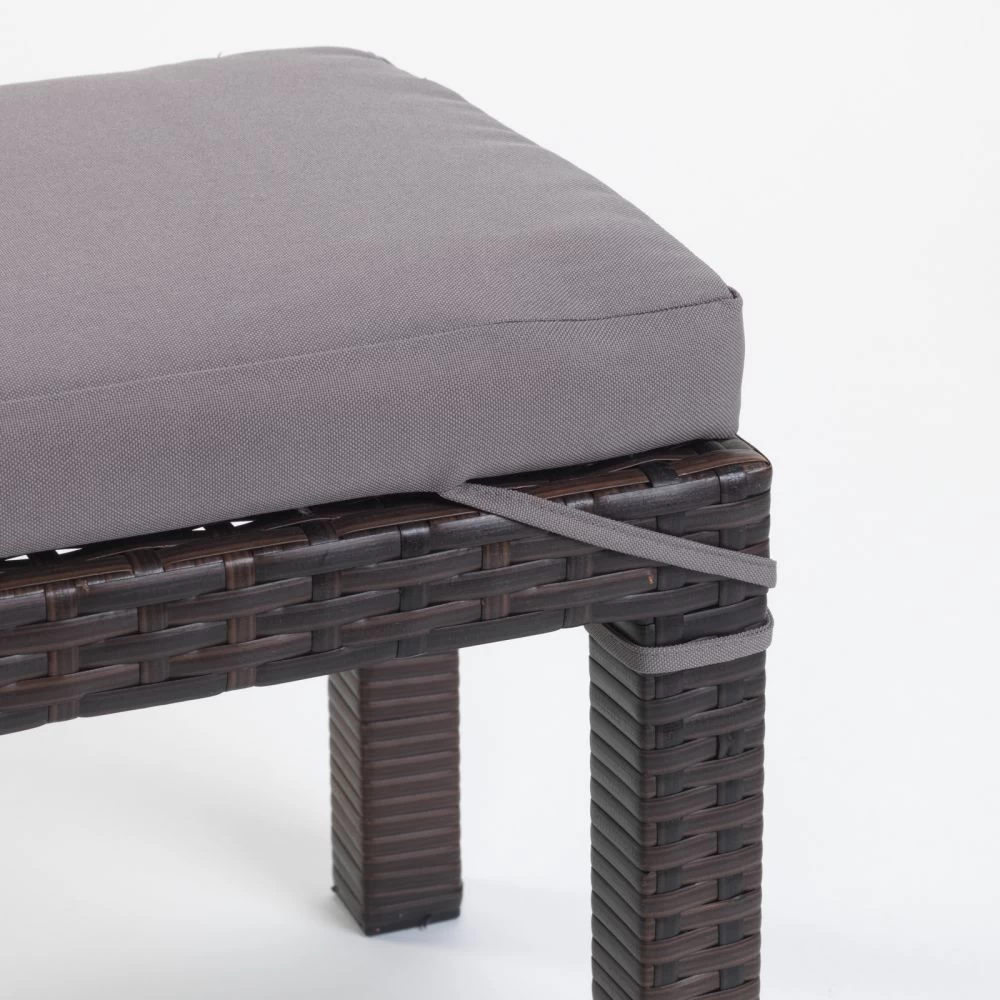Attractive wicker-look dining set for indoor or outdoor use has classic yet contemporary look that enhances any decor. Lightweight aluminum frames are wrapped with variegated plastic strips that look and feel like real wicker, but really hold up to weather – just wipe clean. Bench and chair have thick foam cushions with sun-resistant fabric cover; tabletop is made of solid eucalyptus wood slats that weather to a beautiful silver-gray. Sold in multiple configurations for ordering ease.