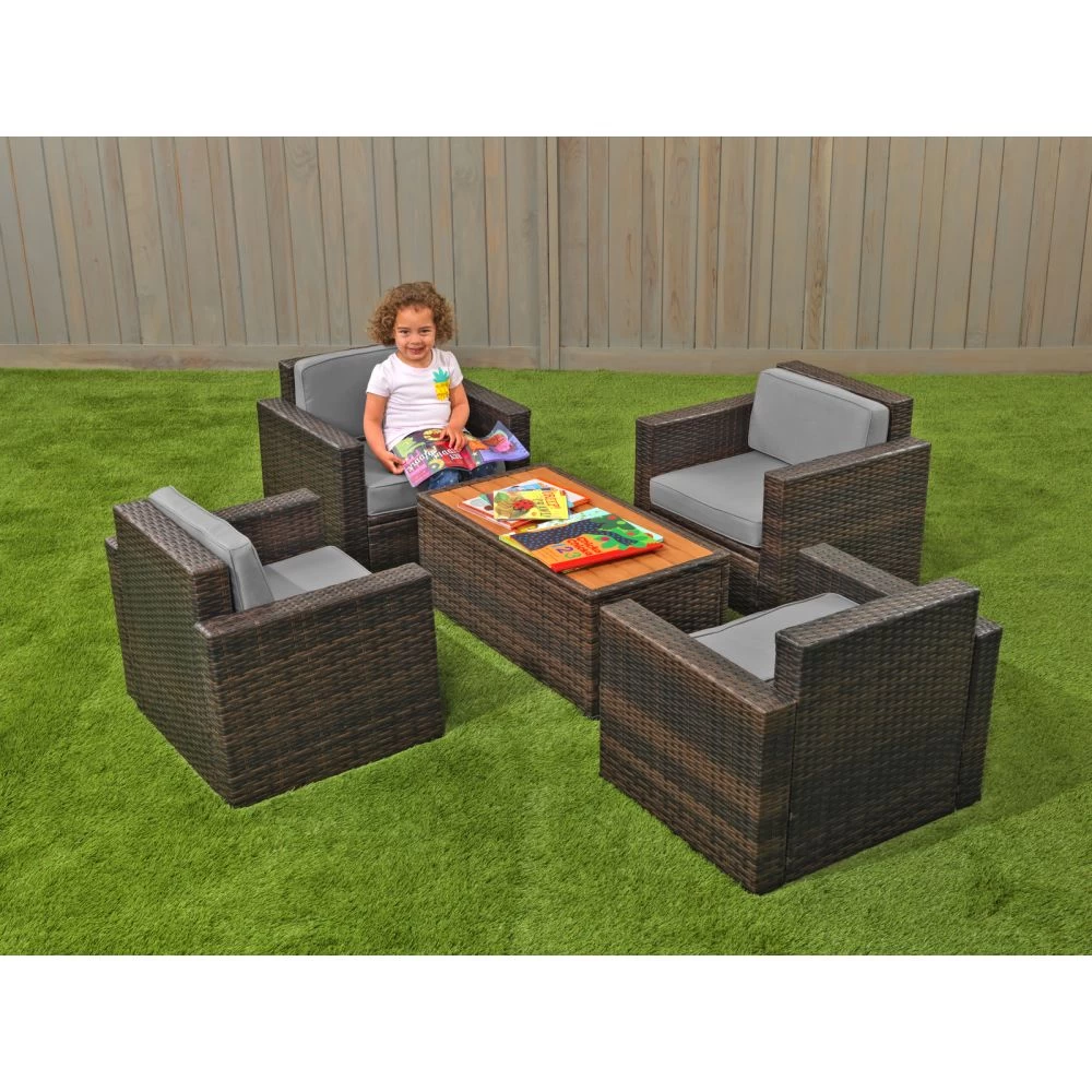 Classic yet contemporary design with clean lines and neutral palette complements any decor. Ideal to create cozy reading-resting-relaxing corner in nature-inspired classroom, outdoor learning area, or at-home deck or patio. Durable, lightweight aluminum frame is covered with variegated strips that look and feel like real wicker. Solid eucalyptus wood tabletop naturally weathers over time. Sized just right for preschoolers. Easy assembly. Set includes: one table and four chairs. For children ages 3 years and older.