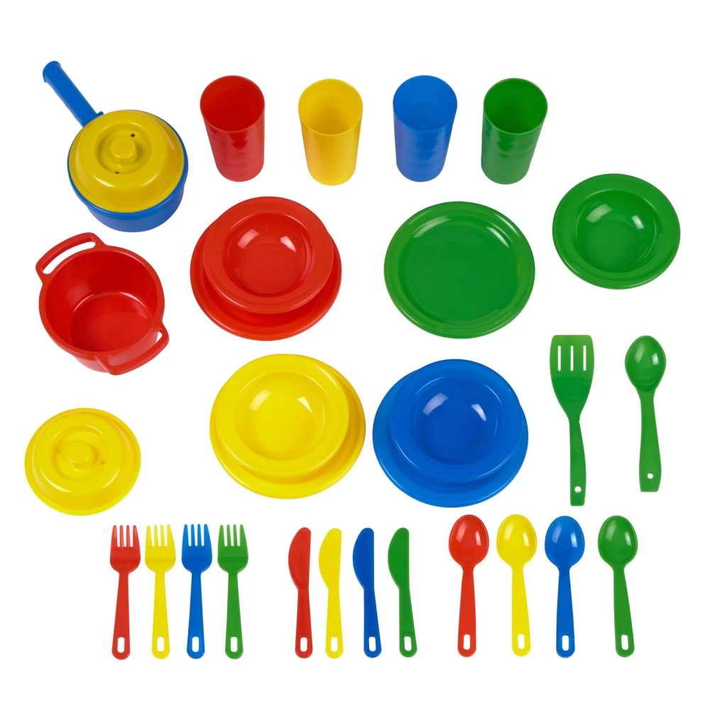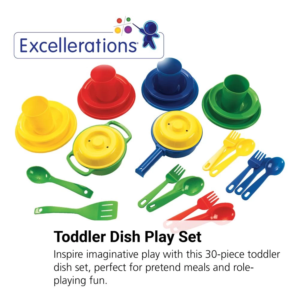 Dishes are sturdy enough to withstand years of play! Bright and durable starter set of dishes for toddlers is made of heavy-duty plastic. Plates are 6-1/2″Dia. Colors vary.