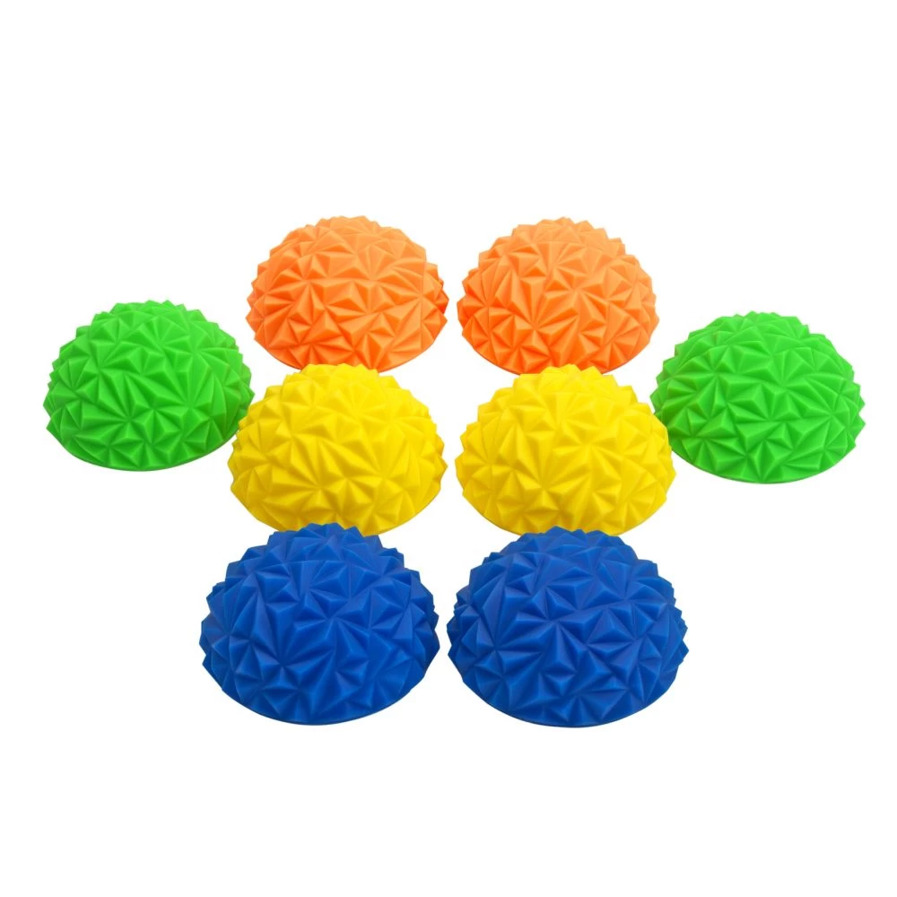 - WHAT YOU GET: A set of 8 PVC Sensory Balance Stepping Stones and 1 air pump. Each stone is 6.5″ in diameter x 3.3″ high (16.5cm x 8.5cm). The stepping stones come in 4 bright colors, 2 blue, 2 green, 2 orange, and 2 yellow.