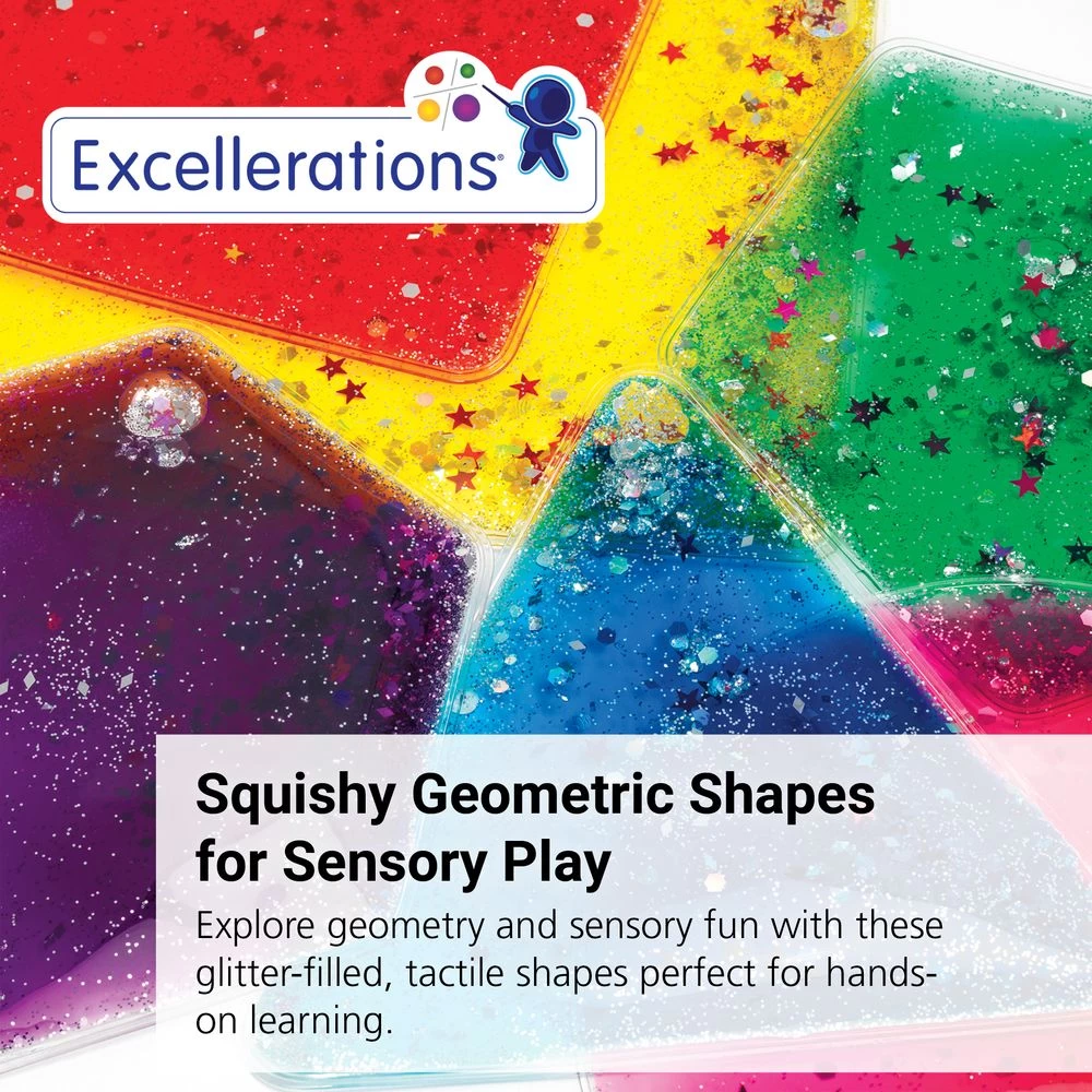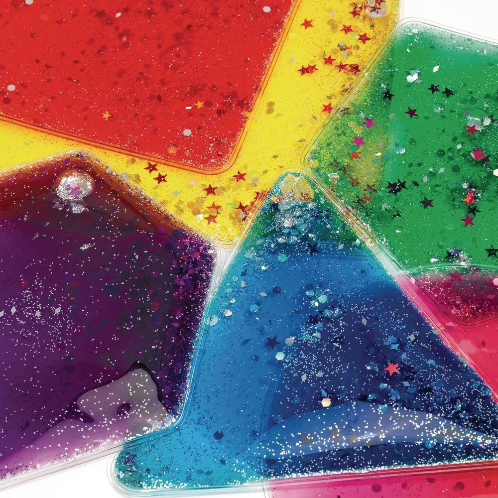 Set of 12 sparkly, squishy liquid filled shapes invite little ones to explore geometry as they observe glitter, sparkles, and shiny bits move with the slightest touch. Generously sized at 5-1/2 inches, shapes perfect for little hands to grasp, poke, and prod. Set includes two of each liquid-filled shape (square, rectangle, triangle, circle, pentagon, and hexagon, excellent light table accessory. Recommended for ages 3+.