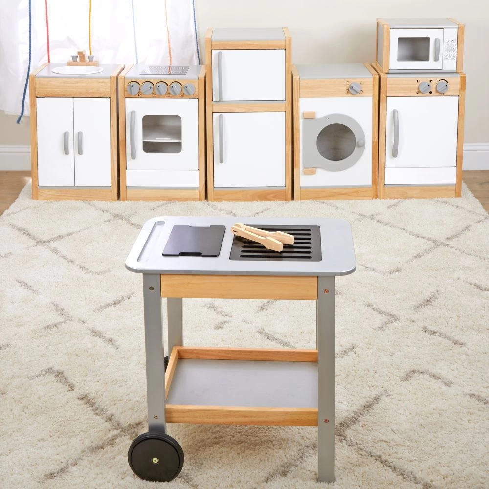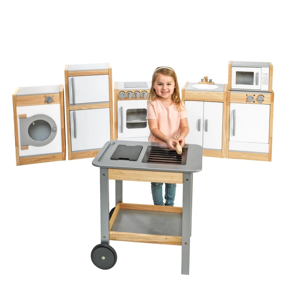 - WHAT YOU GET: Play kitchen stove, fridge, sink , washer/dryer, diswasher and microwave. Some assembly required
