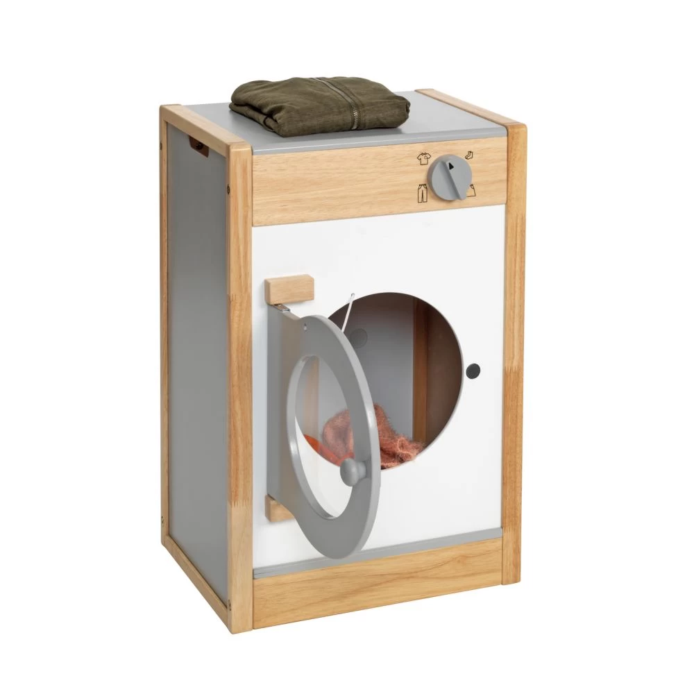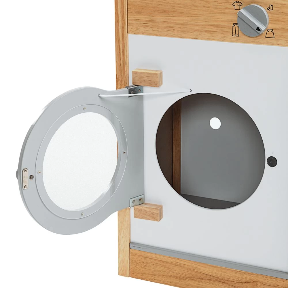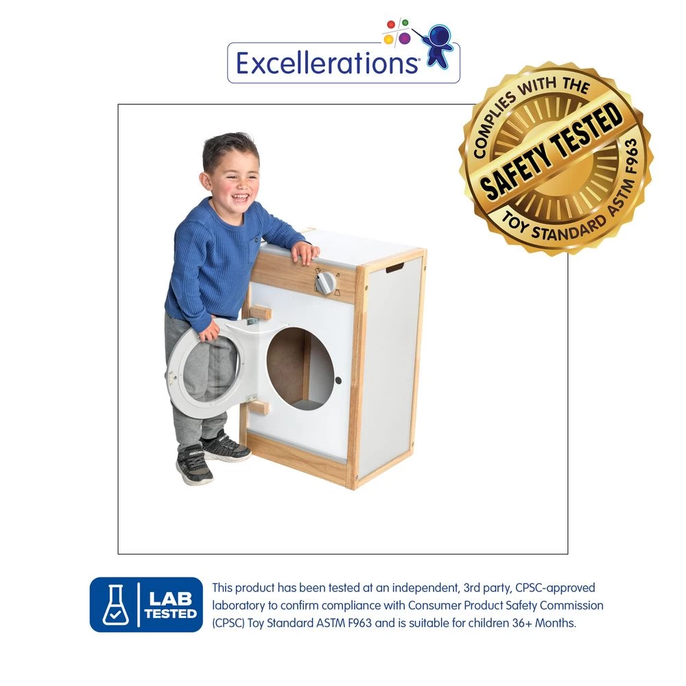 This modern washer will provide years of imaginative play for young children. The front-loading design features a see-through door that opens and closes. A chunky setting knob is movable for little hands to turn. This durable unit also includes plenty of roomy space inside the washing compartment so kids can pretend to do the laundry just like grown-ups! Recommended for ages 36 months and up.