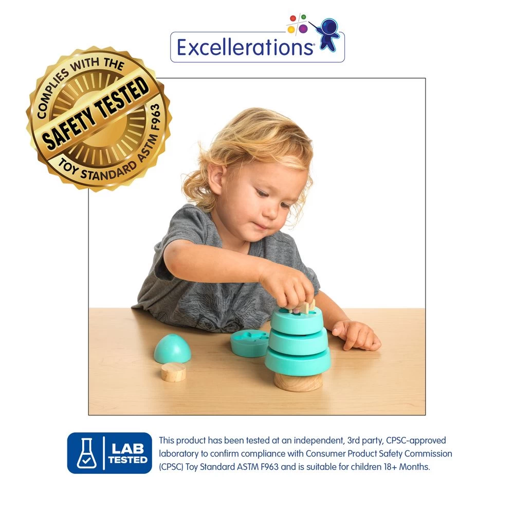 Children explore colors, shapes, and sizes as they match and stack the wooden shapes to form a sustainable stacking tree. The smaller pieces fit into the next size for easy storage. Along with fun, imaginative play time, children practice their problem-solving and visual perception skills. Recommended for ages 18 months+.
