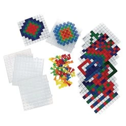 Set of Bases, Pegs, and Activity Cards introduces preschoolers to the world of pixel art as they re-create patterns or make their own imaginative designs. Clear plastic Activity Cards are printed with colored grids fit under the clear bases. Kids insert pegs into bases according to the printed grids to discover 10 different pixelated images. Perfect for use on or off a light table. Includes 4 Clear Bases, 120 Translucent Pegs, and 10 Activity Cards.