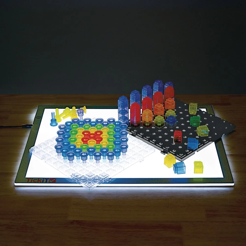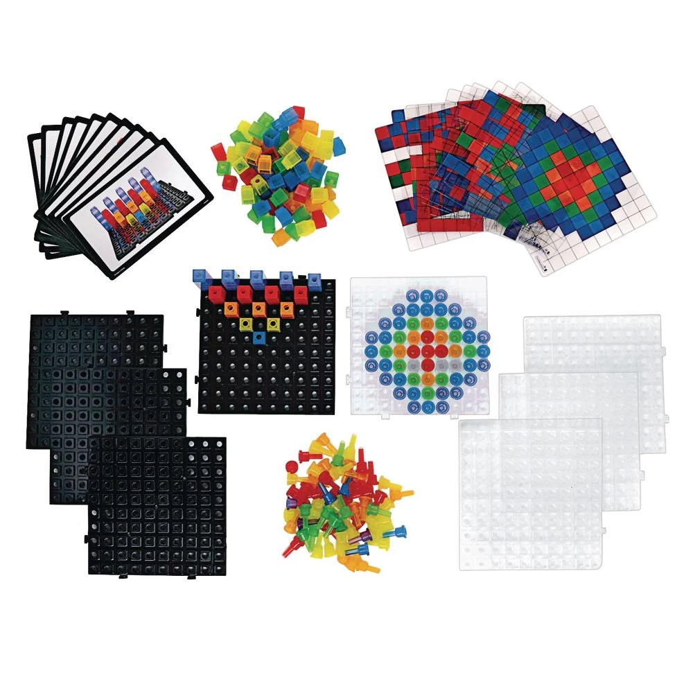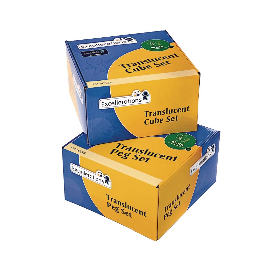 2 Translucent Early Math Activity Sets perfect for use on or off a light table.#CUBELITE: is a set of Bases, Cubes, and Activity Cards introducing preschoolers to early math concepts with engaging activities. Kids can re-create simple or complex patterns or create their own, while exploring counting, quantities, and beginning operations. #PEGLITE: is a set of Bases, Pegs, and Activity Cards introducing preschoolers to the world of pixel art as they re-create patterns or make their own imaginative designs. Two sets with 124 pieces each in convenient storage container. 248 pieces total.