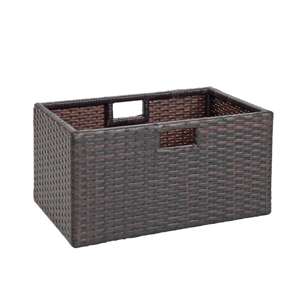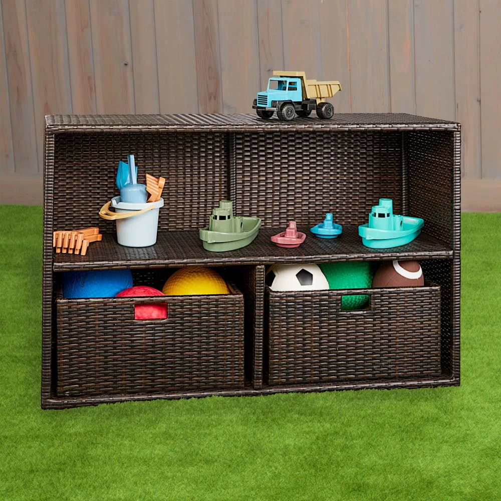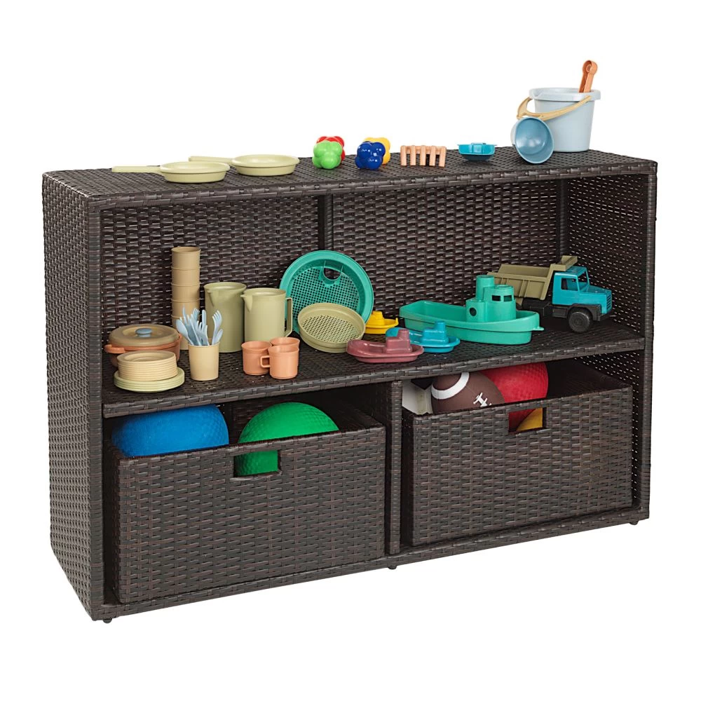 Organize your space with the versatile, three cubby outdoor wicker Storage Shelf and 2 outdoor wicker baskets. New configuration of the shelves allows for flexibility in storing a variety of sized objects. Available in a neutral colorway, the Wicker Storage Shelf is an attractive storage piece and makes a lovely addition to any decor, inside or out. Keep things close at hand, yet hidden, by stowing books, toys and more inside the durable wicker baskets.