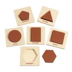 - NATURAL COLORS, STURDY DESIGN: Painted in a natural color palette, the thick puzzle pieces feature 6 shapes – circle, square, triangle, rectangle, hexagon, and pentagon. The trays each measure 3-3/4 x 3-3/4 inches. Each piece wipes clean with a damp cloth. Recommended for ages 2 and up.