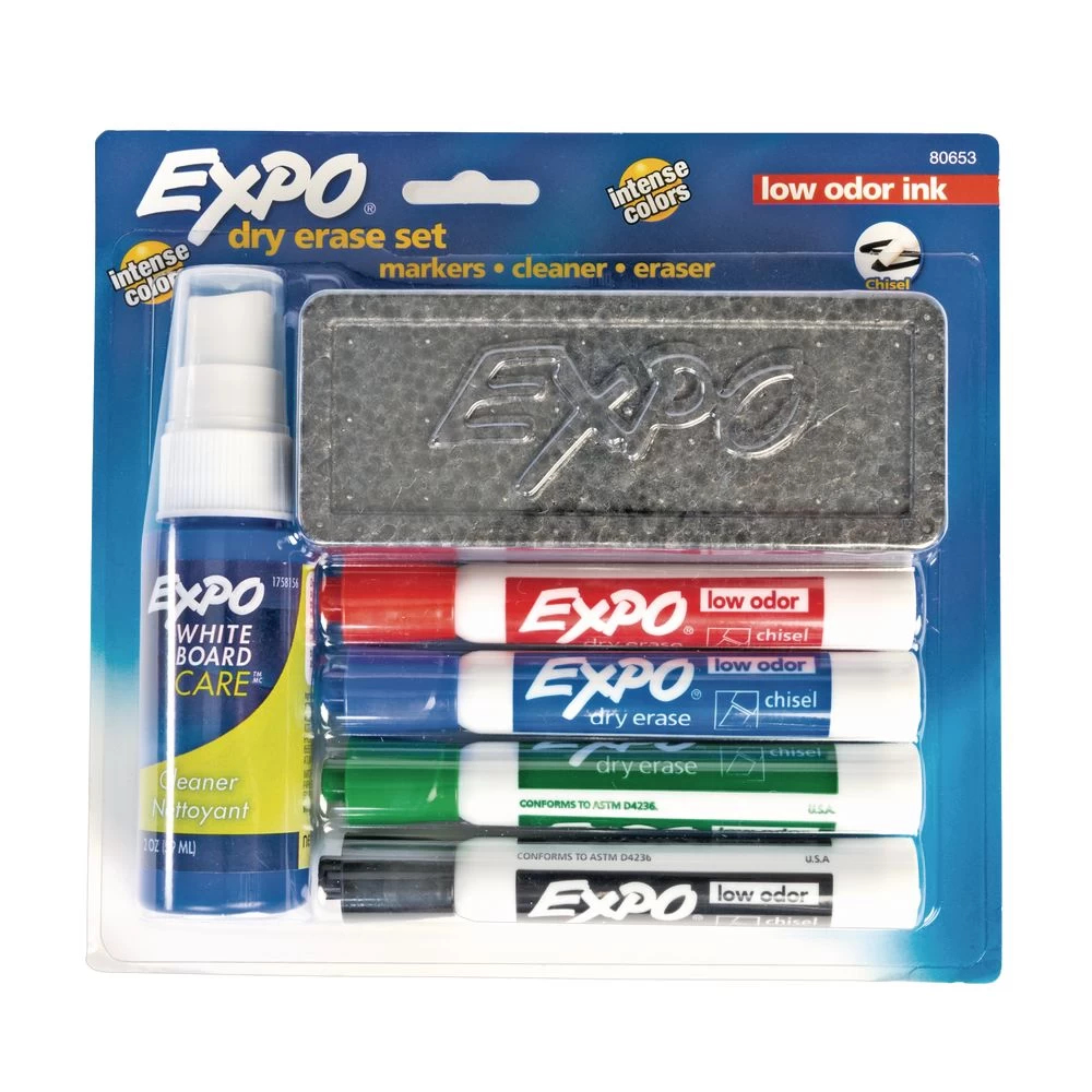- Includes a soft-pile eraser, 2oz. bottle of Expo® cleaner for whiteboards and 4 chisel-tip dry-erase markers in the most popular colors