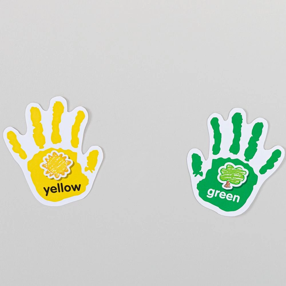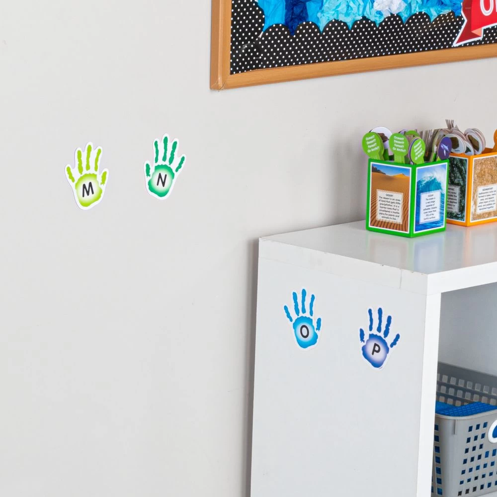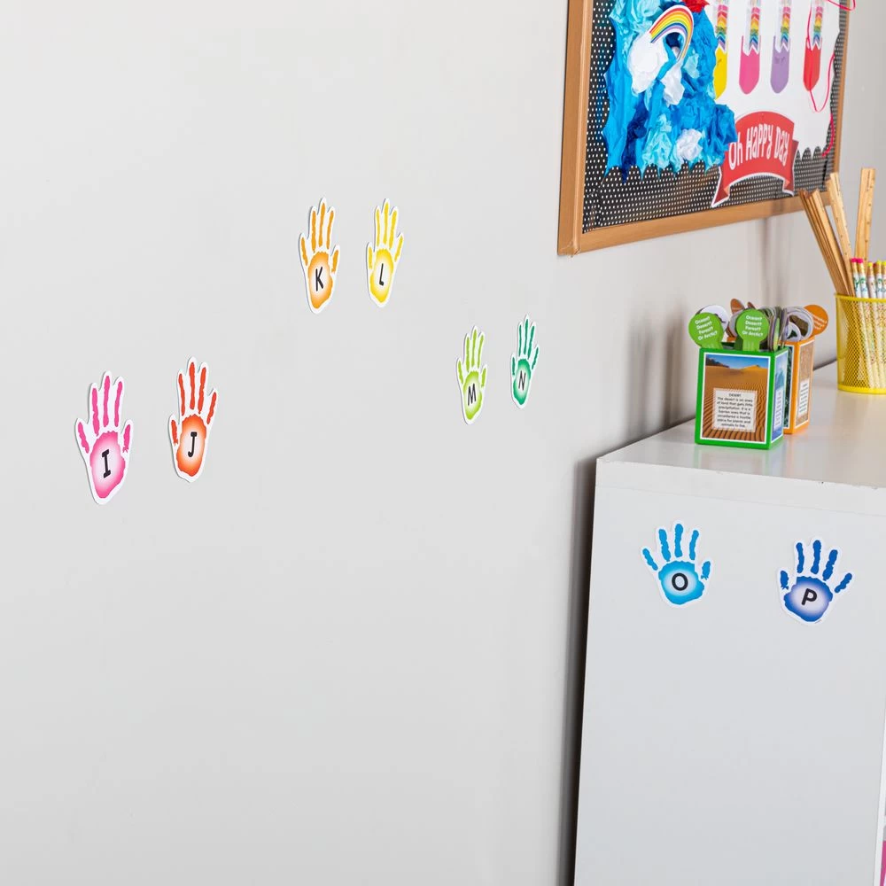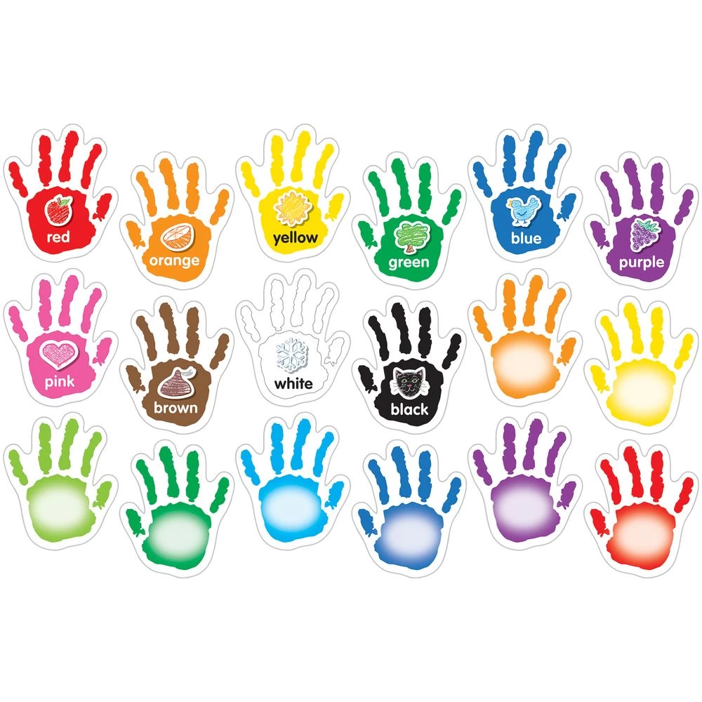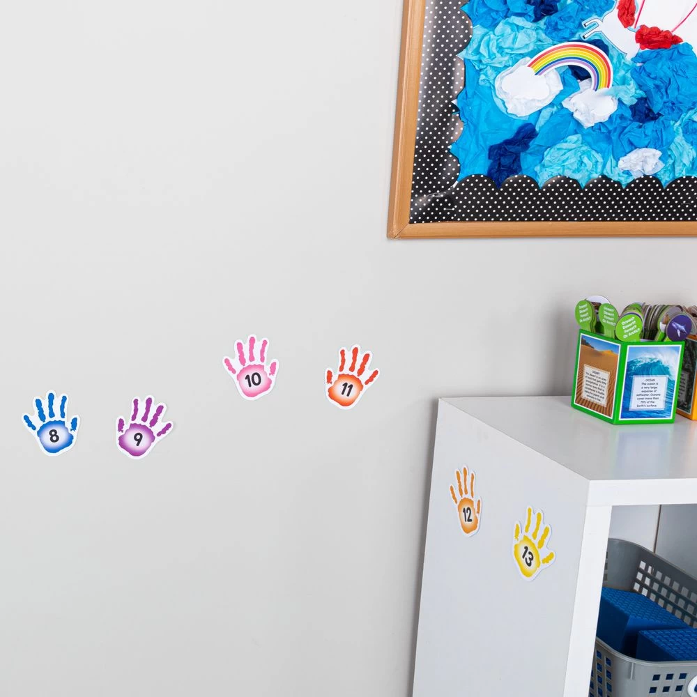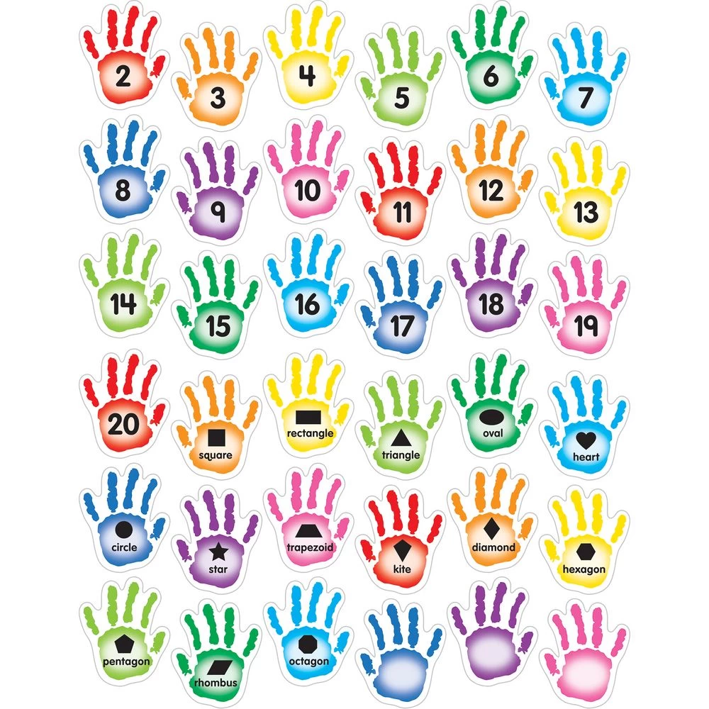 Stick these colorful hand decals to the wall and have kids high-five them as they identify colors, shapes, letters, and numbers.*108 Hands In Bright Colors: Our hand decals come in bright colors. Most of the hands have shapes, colors, letters, or numbers printed on them, and 11 are blank. They’re a fun way to review and assess kids’ knowledge.*Reusable: The colorful decals stick to most surfaces and come off easily, leaving no residue behind. They’re easy to rearrange. Use them again and again.*Gets Kids Out Of Their Seats: Invite kids to go up and high-five a hand with a specific color, shape, letter, or number on it. High-five decals add a fun element of interactivity to skills practice.Make skills practice interactive with these colorful hand decals featuring shapes, colors, letters, and numbers.