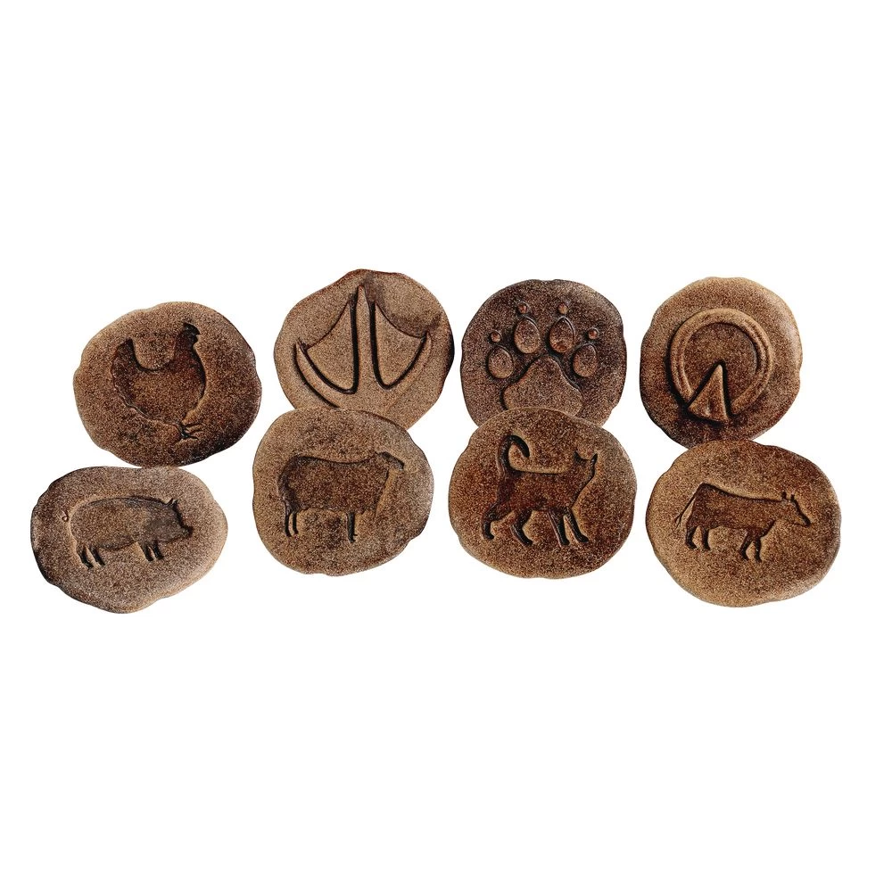 Each double-sided stone has the raised footprint of an animal on one side and an image of the animal indented into the other side.