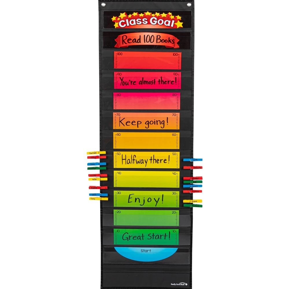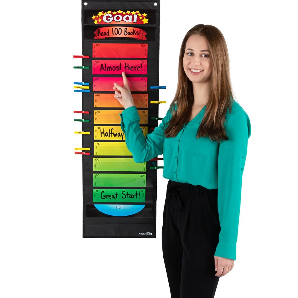 Use this colorful and inventive pocket chart system to manage classroom behavior. Its a great way to convey how the class is doing, behavior- wise, without words! Slip the cards into the pocket chart to create a thermometer, and use the colorful clothespins with student names or numbers written on them to mark how class behavior is measuring up!*A Visual Record: Place these vibrantly designed goal thermometer pocket chart cards in the pocket chart to convey visually how class behavior is doing. Write students names or numbers on the clothespins and use them to track progress. Let kids know how theyre measuring up, without saying a word!*Double-Sided And Customizable: These well-designed cards are double-sided, with number increments to 100 on one side and blank lines on the other for flexibility.*Make Behavior A Goal: Everyone learns better in a well-regulated environment, and this chart lets kids know their behavior is measurable and important. Turn class behavior into a shared goal.*Laminated And Dry Erase: The pocket chart and clothespins are sturdy and the pocket chart cards are laminated and write-on/wipe-off, so they will last and are reusable. A system thats eco-friendly as well as classroom-friendly!*Clothespins Make It Fun: The rainbow-colored clothespins make tracking classroom behavior a fun task…plus you can find many other classroom uses for these practical and pretty clothespins!Make classroom behavior a shared responsibility with this long pocket chart, vibrant goal-tracking cards, and clothespins.